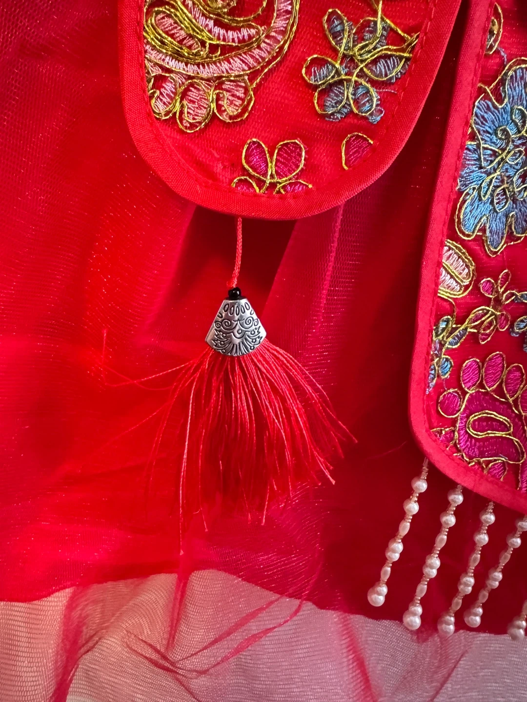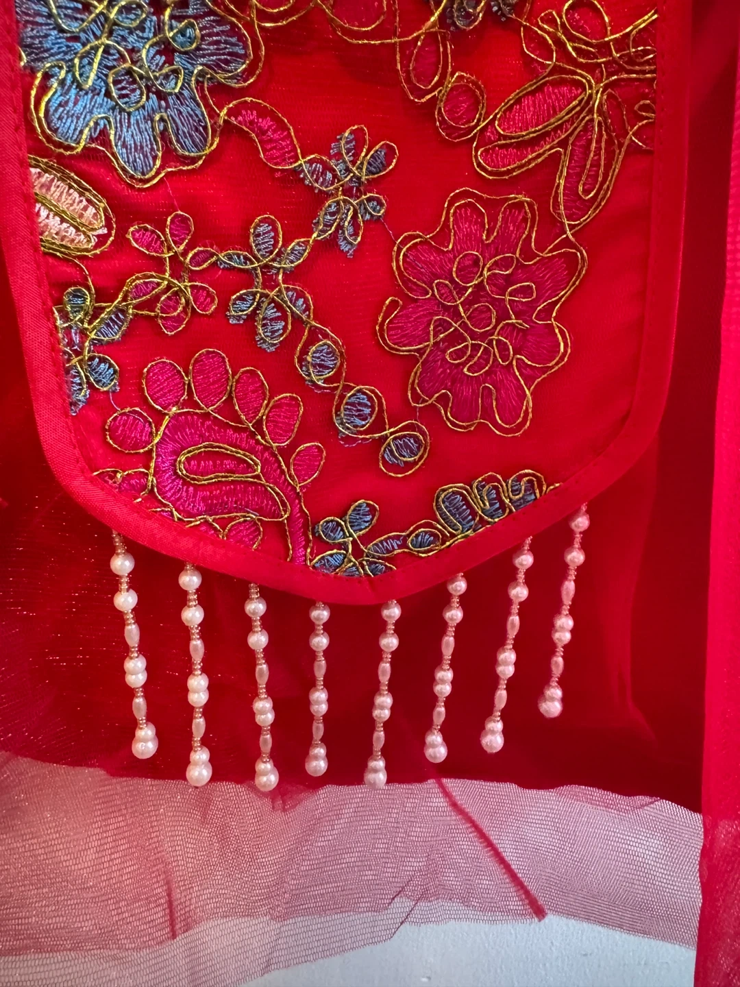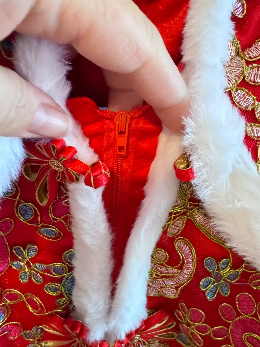A beautiful red jacket perfect for Chinese New Year celebrations! It features intricate floral embroidery, a soft faux fur trim, and cute pearl detailing. It's in great condition and ready for a new home