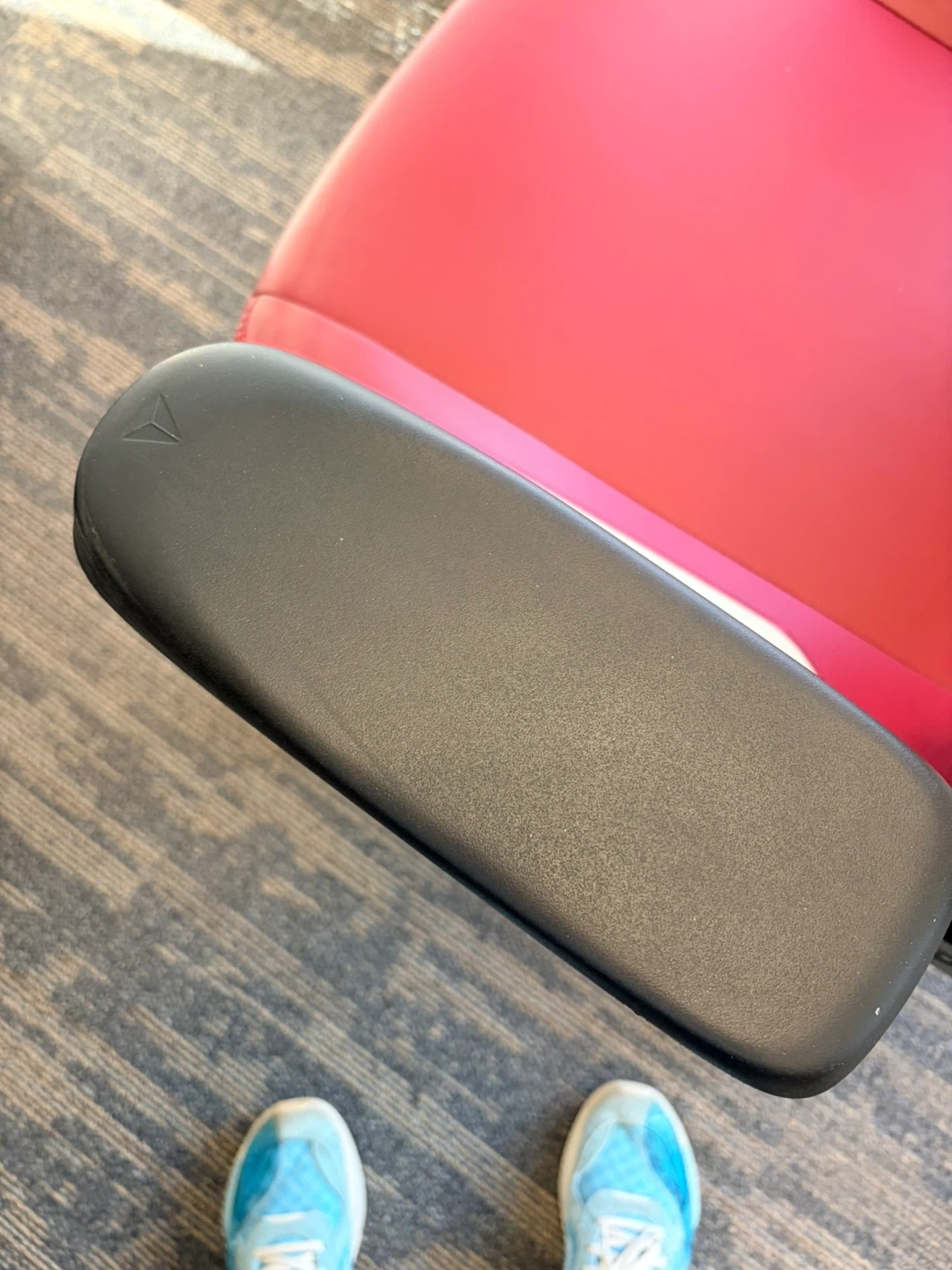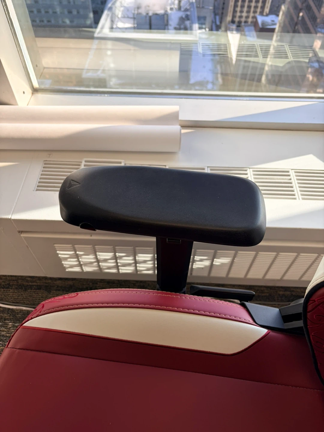 This is a Secretlab gaming chair in red and white. It features an adjustable headrest and armrests. The chair is upholstered in a durable material.
