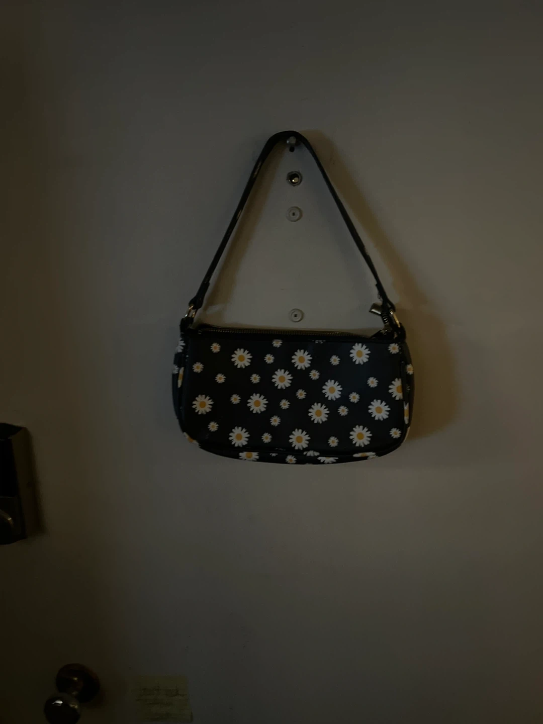 This shoulder bag features a black base with a repeating white daisy print. It's a stylish accessory for everyday use. It has a zipper closure and a single strap.
