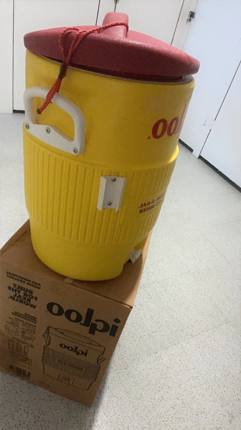 Selling an Igloo Industrial 5-gallon drinking water cooler. It's yellow with a red lid and has a spigot for easy dispensing. Comes with the original box!