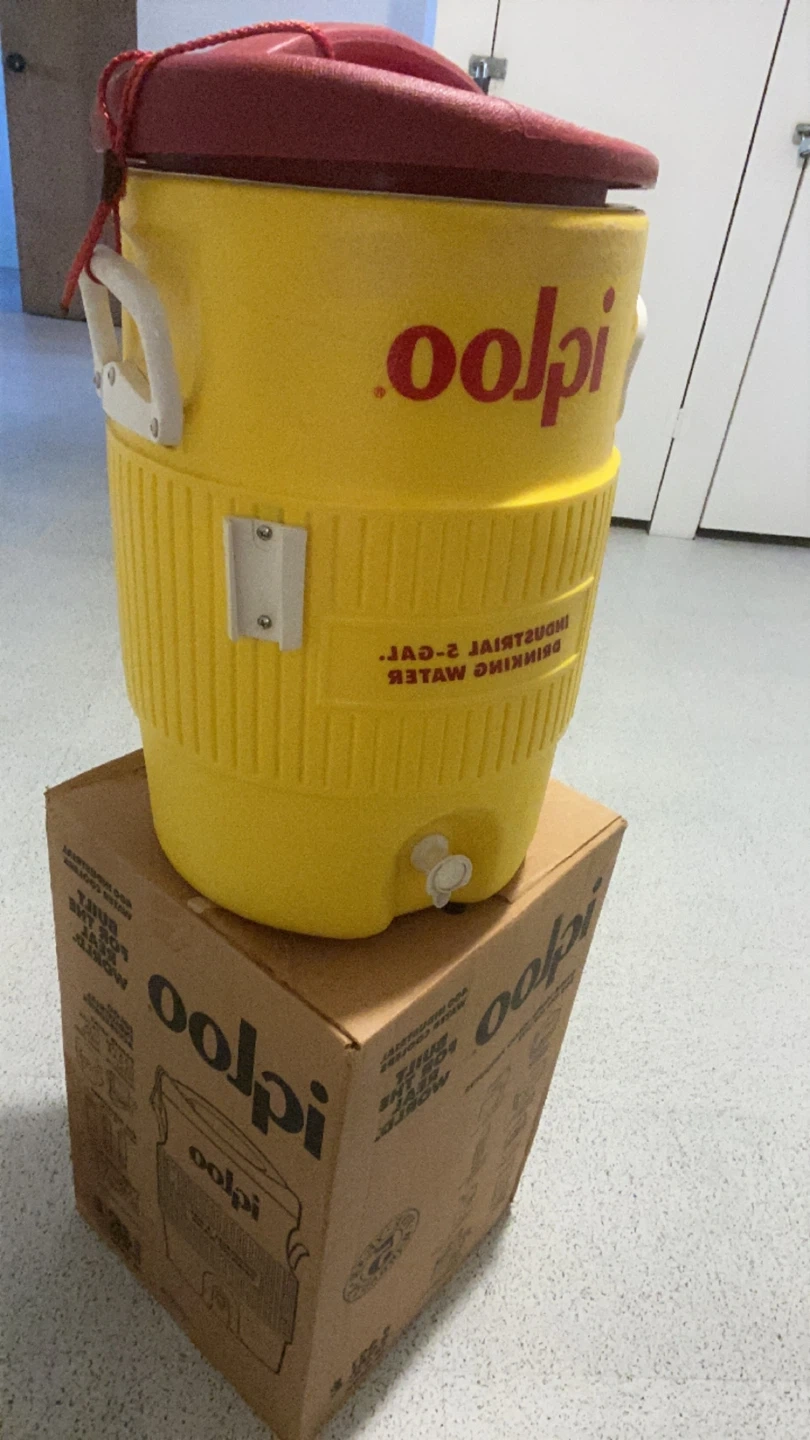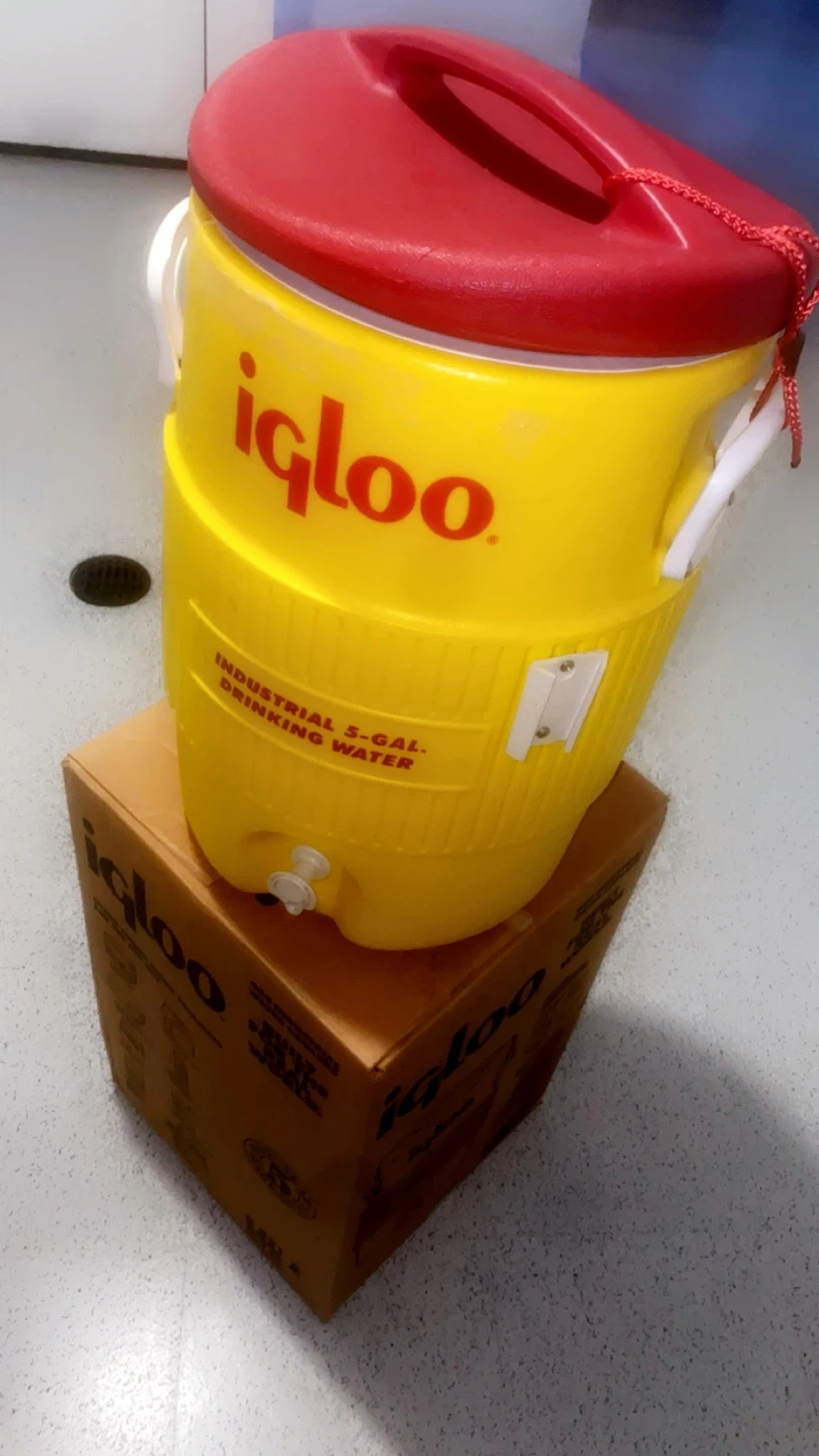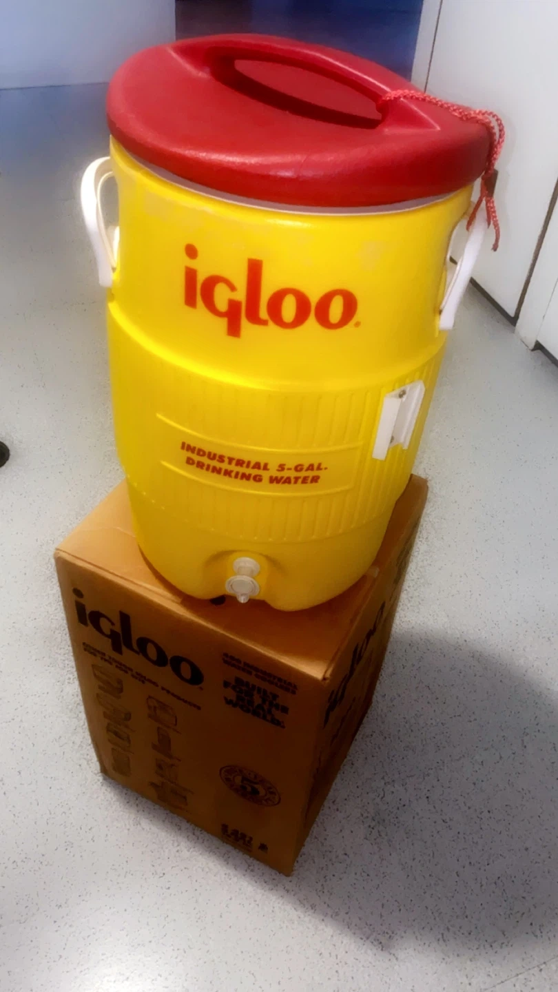 Selling an Igloo Industrial 5-gallon drinking water cooler. It's yellow with a red lid and has a spigot for easy dispensing. Comes with the original box!