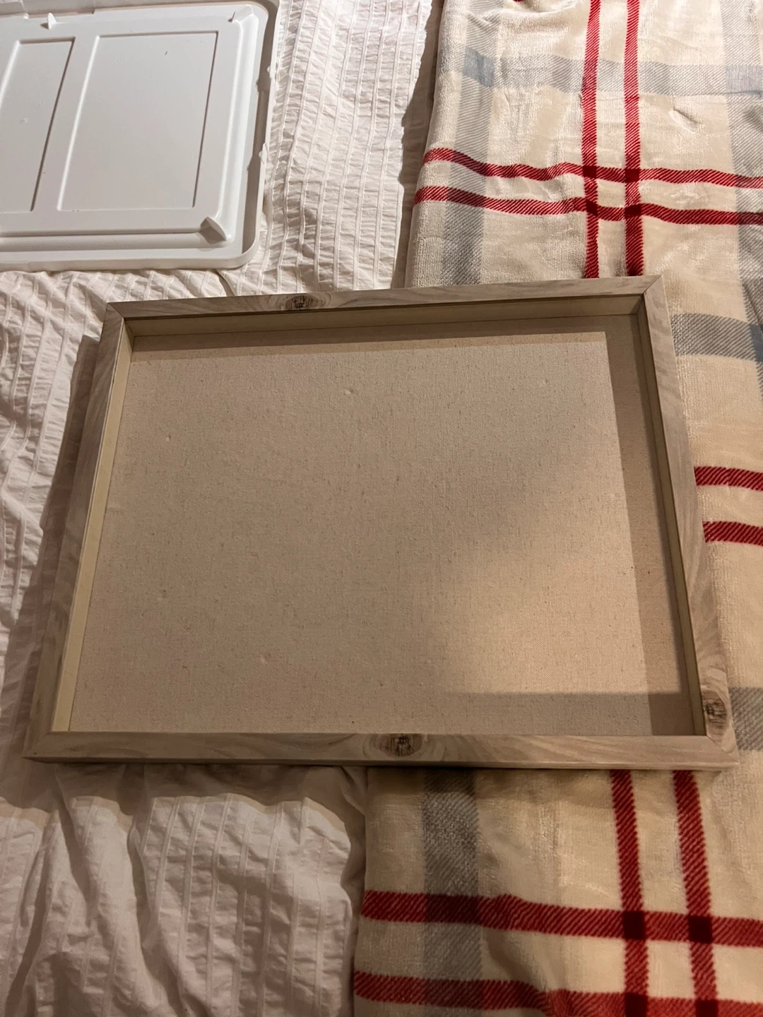 Selling a wooden framed canvas, perfect for your next art project or home decor. It has a canvas backing that you can push pins into. It's in great condition and ready for a new creation.