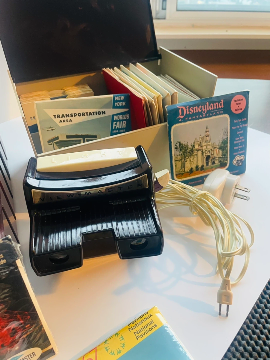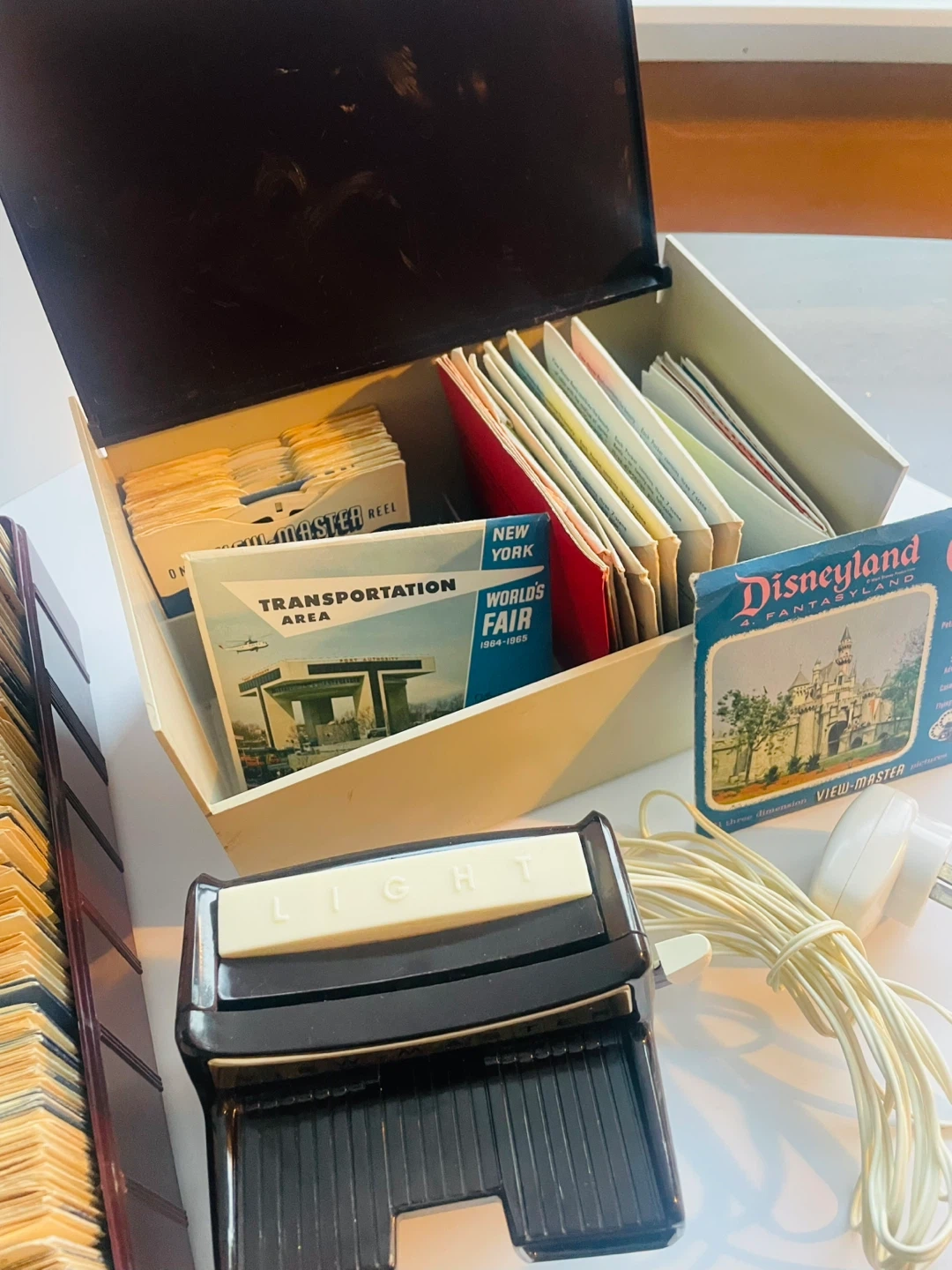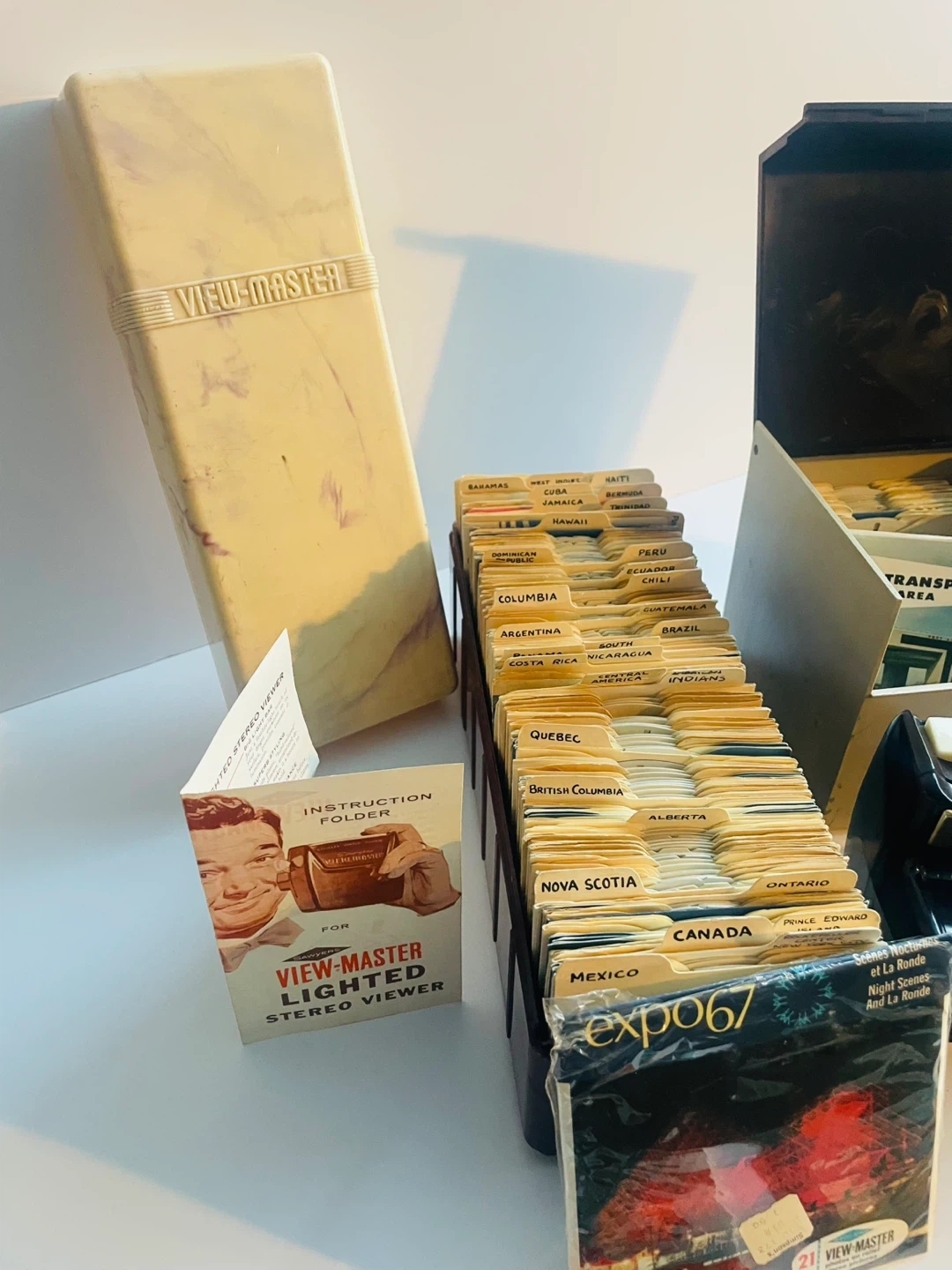 This View-Master collection includes a lighted stereo viewer and a large collection of over 300 reels. It features reels from various countries and destinations like Disneyland, Expo '67, and the World's Fair. There's also a storage case and instruction booklet included.