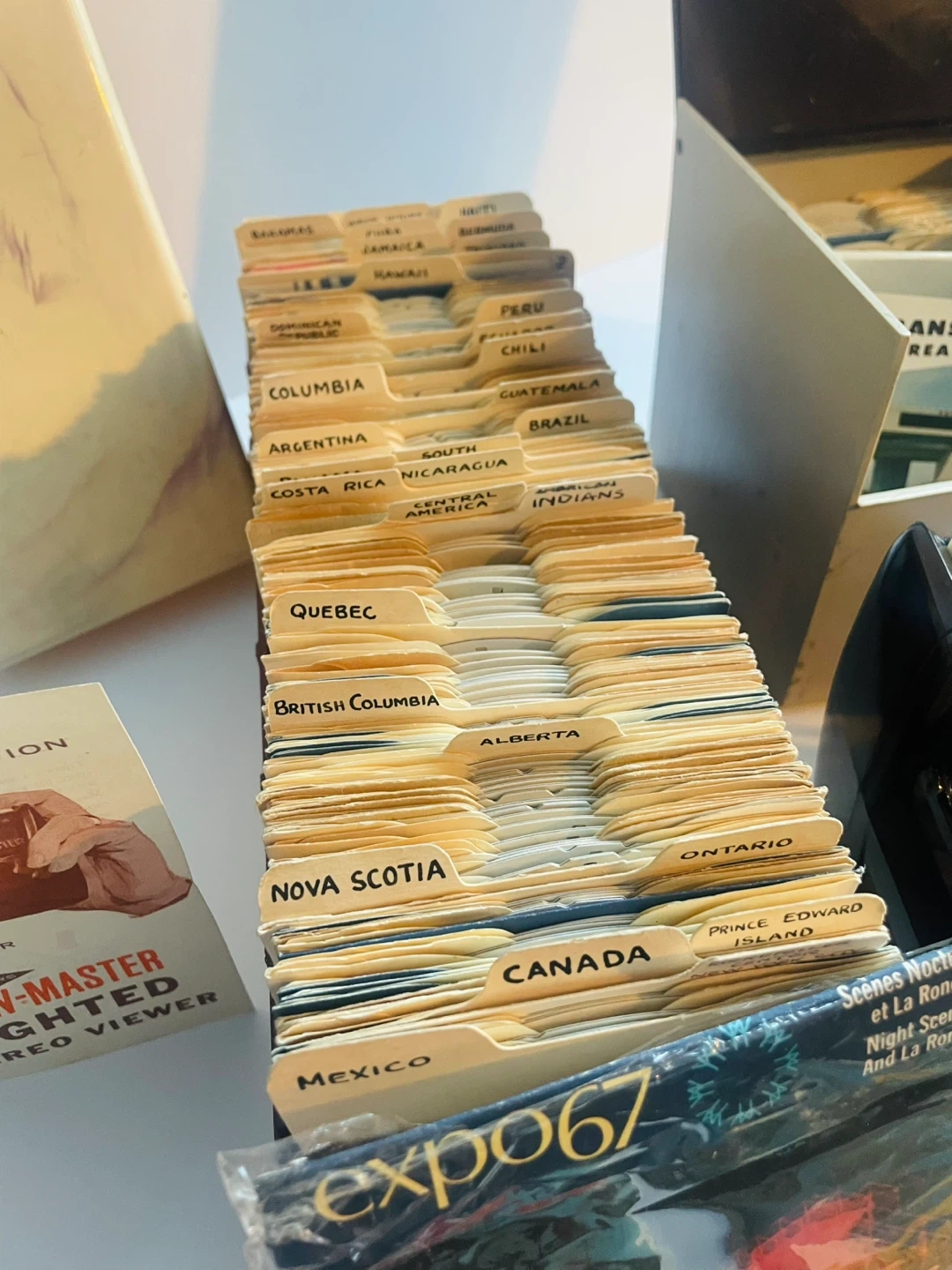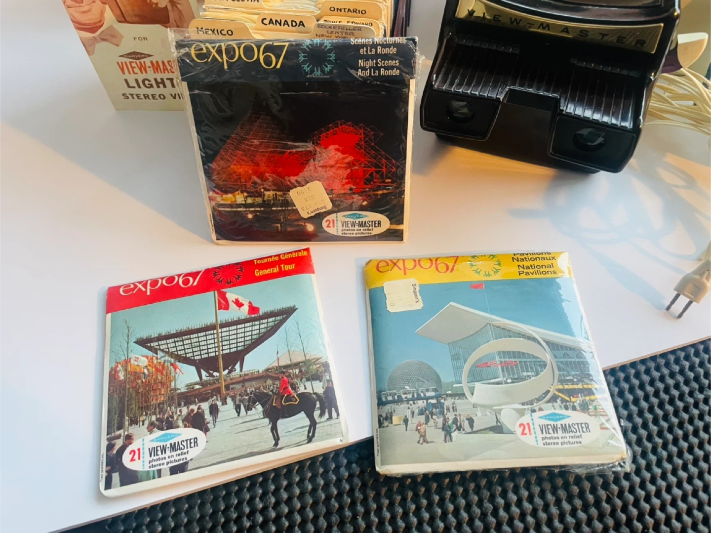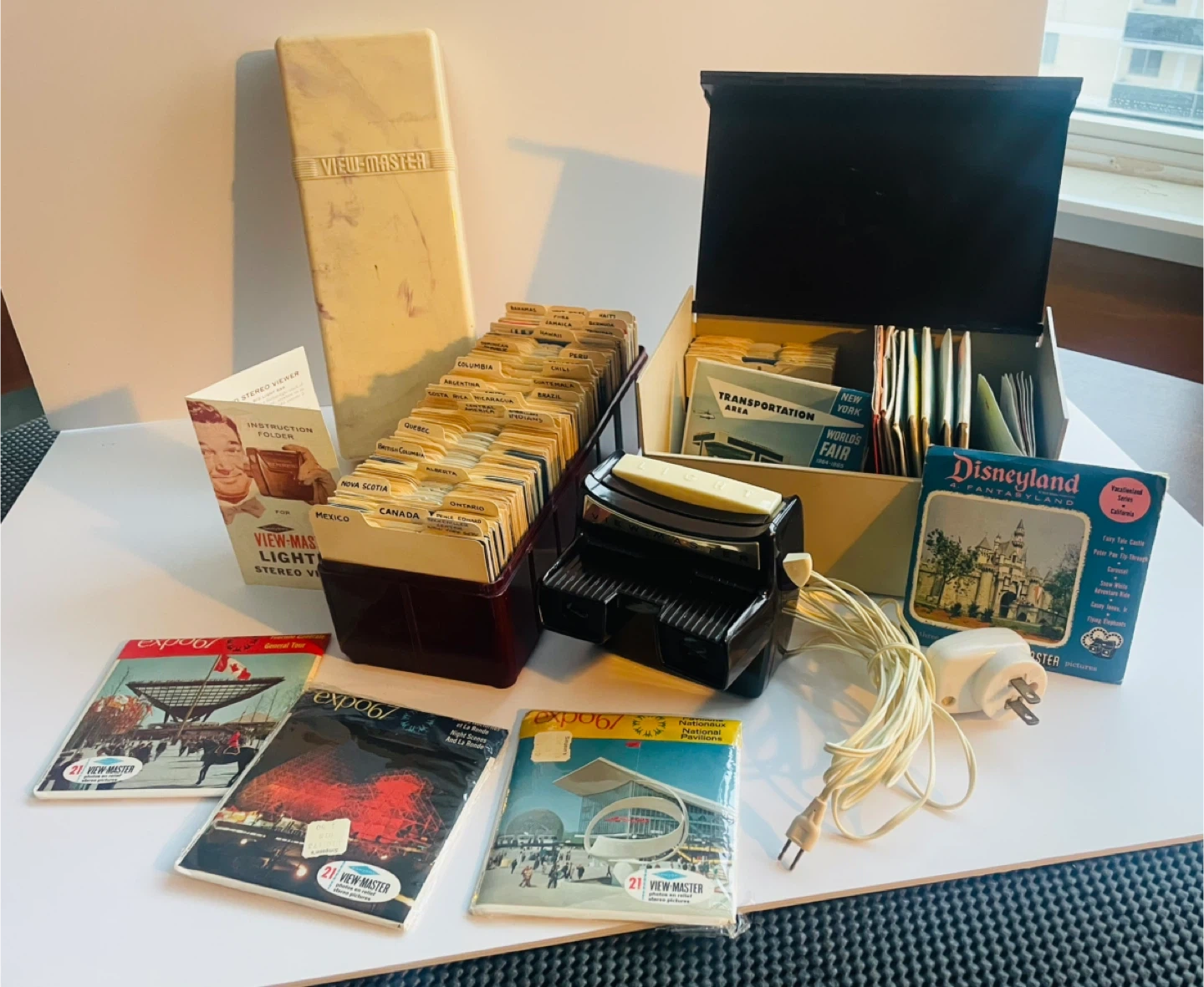This View-Master collection includes a lighted stereo viewer and a large collection of over 300 reels. It features reels from various countries and destinations like Disneyland, Expo '67, and the World's Fair. There's also a storage case and instruction booklet included.