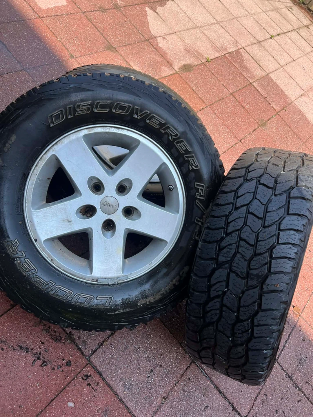 Four all-terrain tires from Cooper. They are sized LT265/70R17. Two of the tires are Cooper Discoverer A/T3 and two are Goodyear Wrangler All-Terrain Adventure with Kevlar.