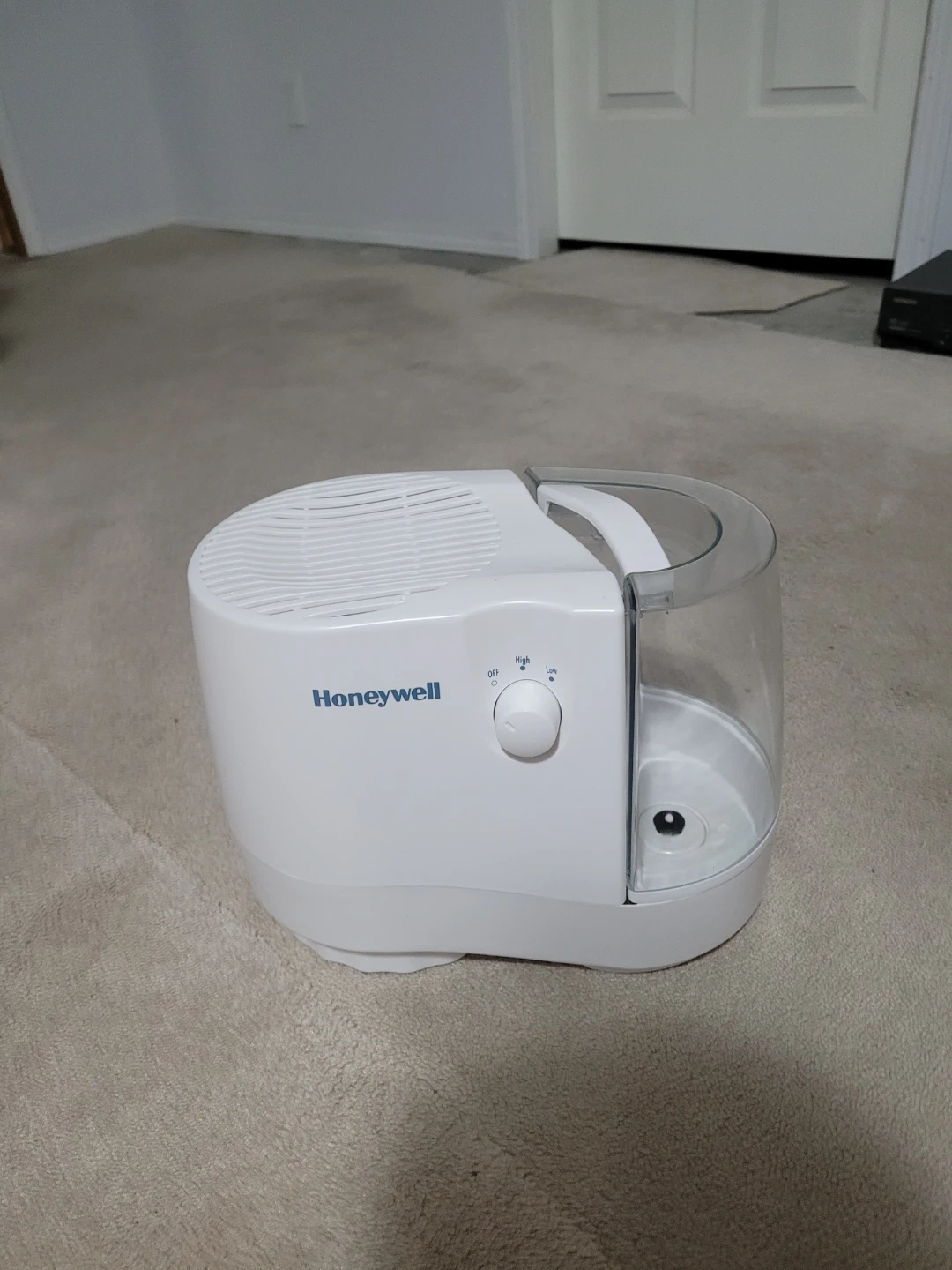White Honeywell humidifier with a clear water tank. It has adjustable settings for off, low, and high. This is great for adding moisture to your living space!