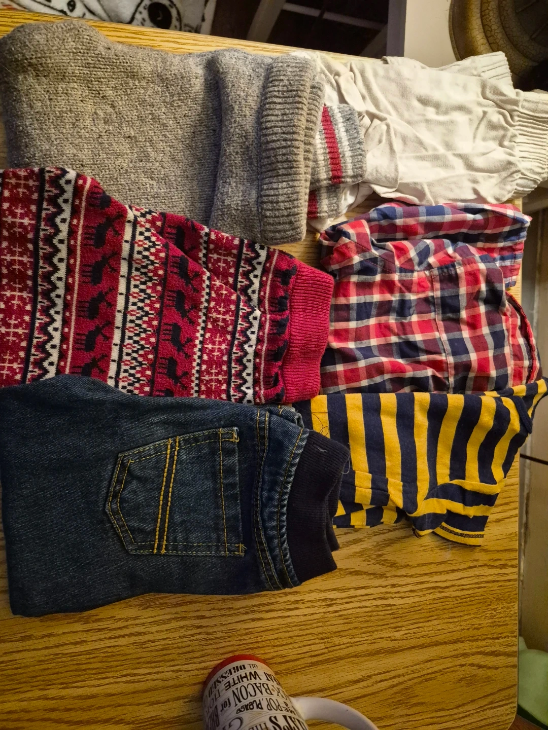 Bundle includes a grey knit sweater with a festive pattern, blue denim jeans with yellow stitching, a red plaid shirt, and a yellow and blue striped shirt. Great for everyday wear and playtime! 24 mths dog friendly home