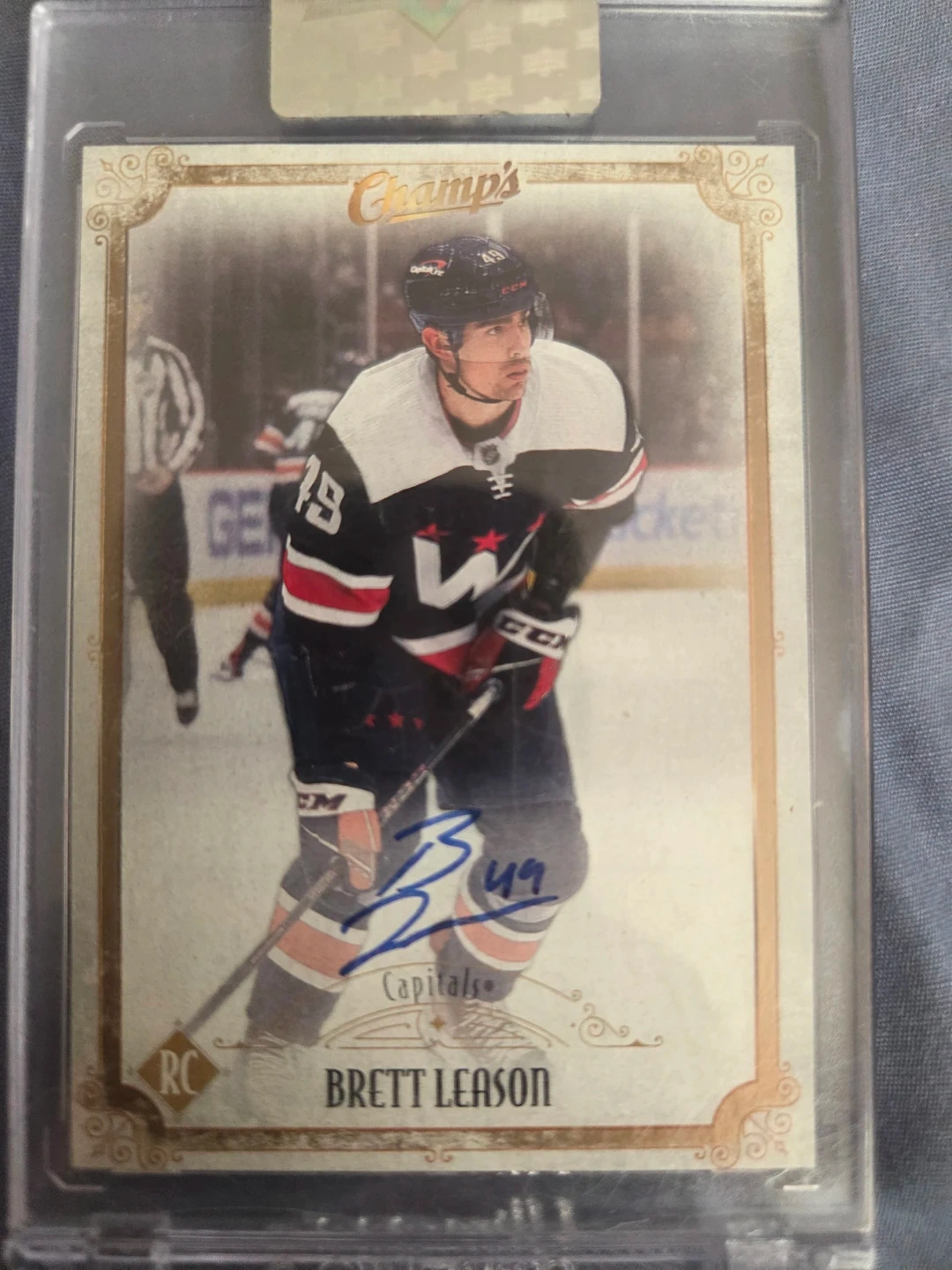 This is an autographed trading card of Brett Leason, Right Wing. It's certified authentic by The Upper Deck Company. The card shows Leason in his Capitals uniform.