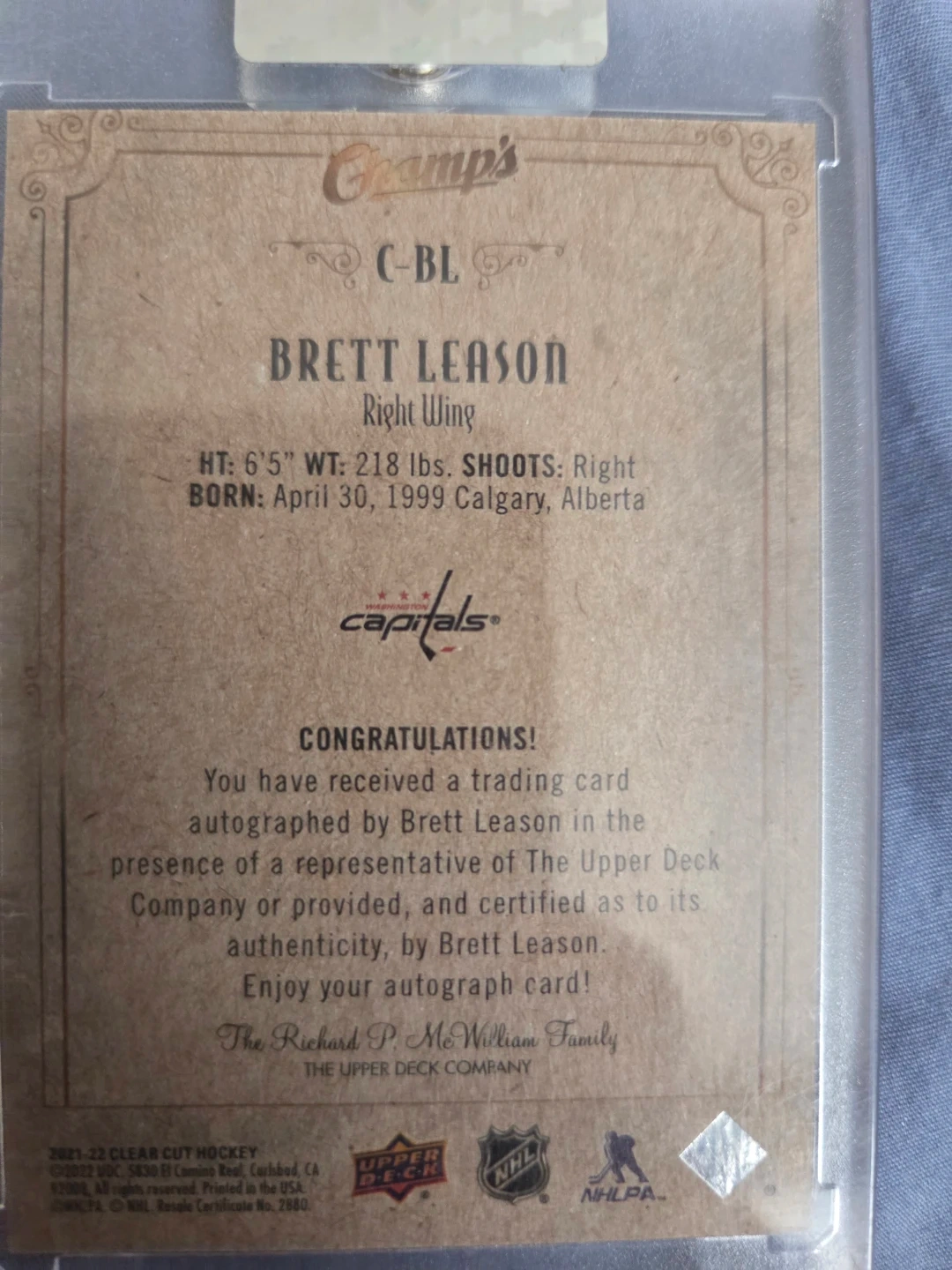 This is an autographed trading card of Brett Leason, Right Wing. It's certified authentic by The Upper Deck Company. The card shows Leason in his Capitals uniform.
