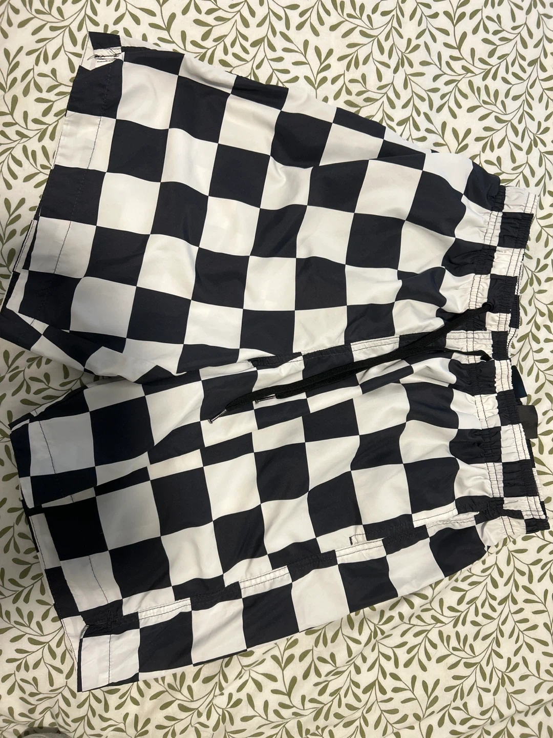 H&M swim shorts in a checkerboard pattern. Size L. Elastic waistband with a drawstring. Mesh lining inside.
