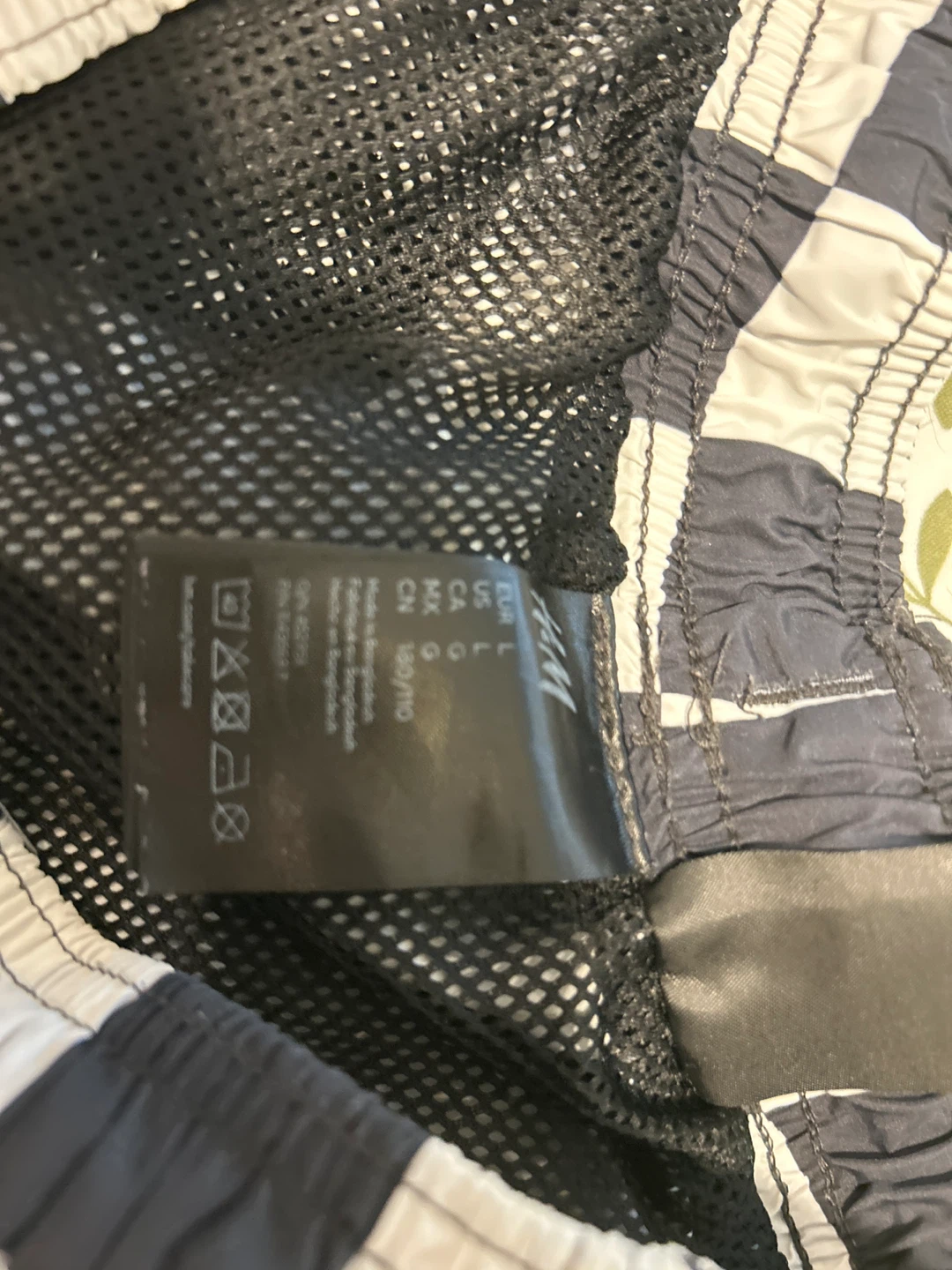 H&M swim shorts in a checkerboard pattern. Size L. Elastic waistband with a drawstring. Mesh lining inside.