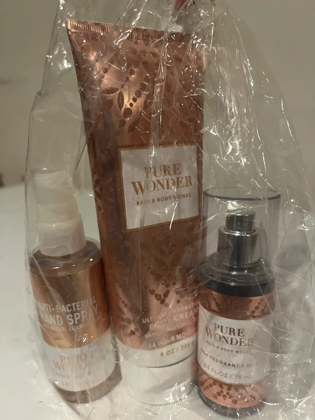 Bath & Body Works Pure Wonder 3 PC’s set. Set includes body cream 8oz, fragrance mist 2.5fl oz, & hand spray 3 oz. All new in the pack. From smoke pet free and a healthy home.