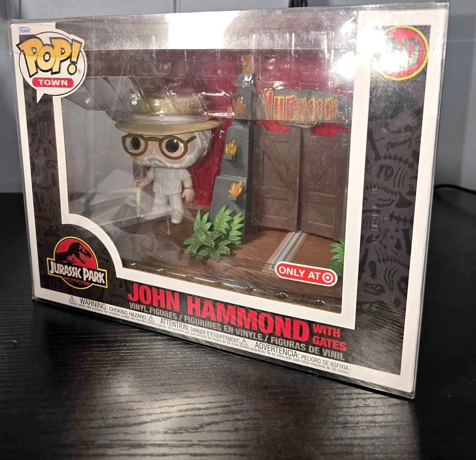 This is a Funko Pop! Town figure featuring John Hammond with the iconic Jurassic Park gates. It's part of the Jurassic Park collection, number 30. The vinyl figure includes a diorama of the park entrance. Pick-up only. Cash only.