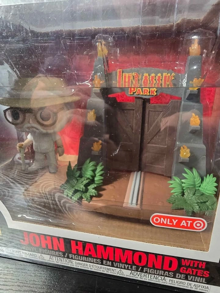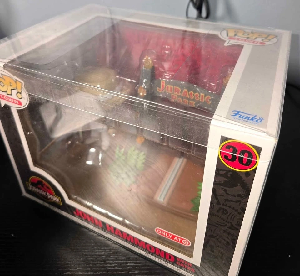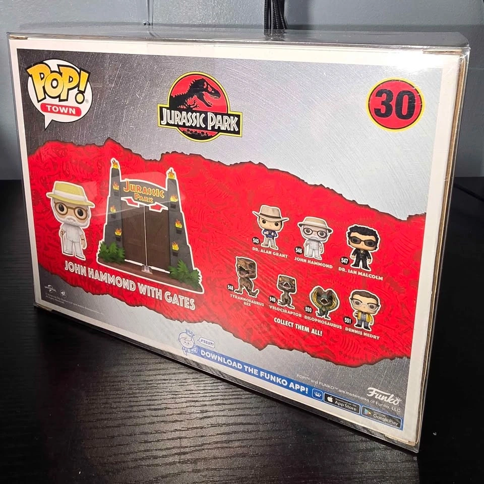 This is a Funko Pop! Town figure featuring John Hammond with the iconic Jurassic Park gates. It's part of the Jurassic Park collection, number 30. The vinyl figure includes a diorama of the park entrance. Pick-up only. Cash only.