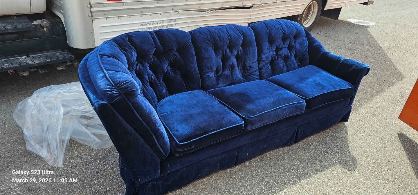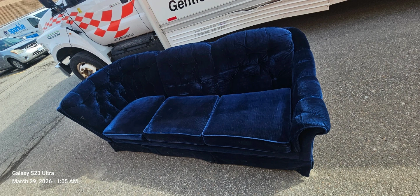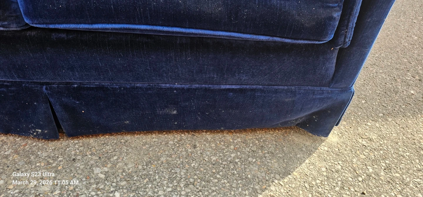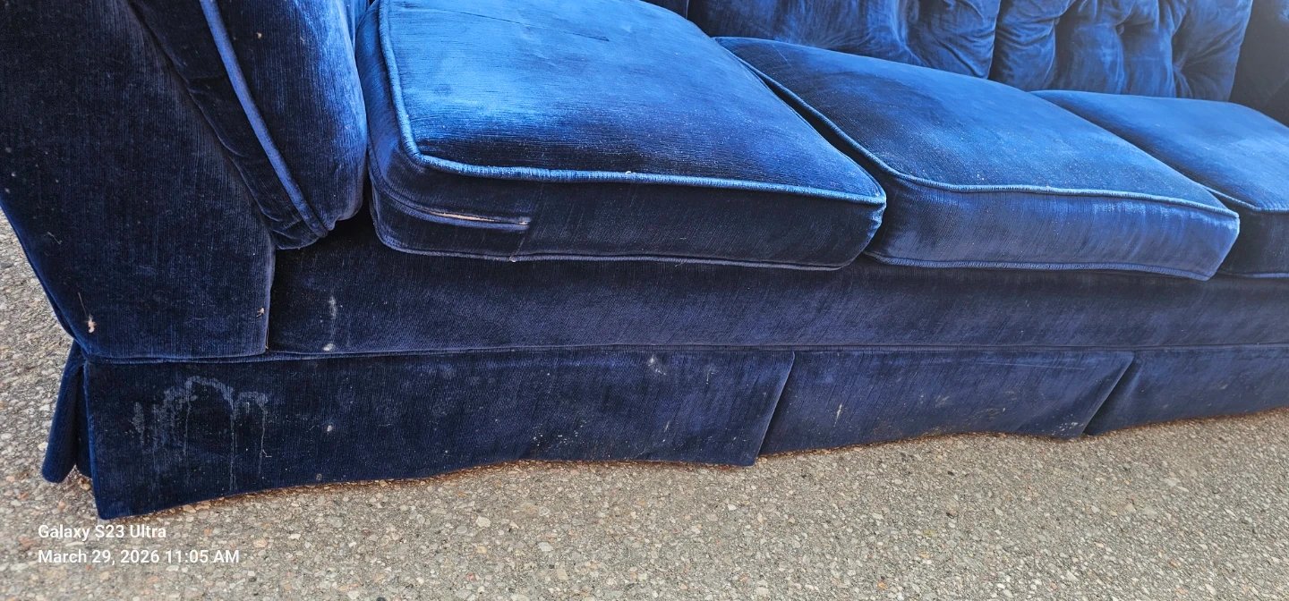 A plush blue velvet sofa with a tufted back and rolled arms. It has a skirted base and upholstered cushions. Some marks are visible on the lower front panel. Delivered for 100 extra but only in the next 5 hours