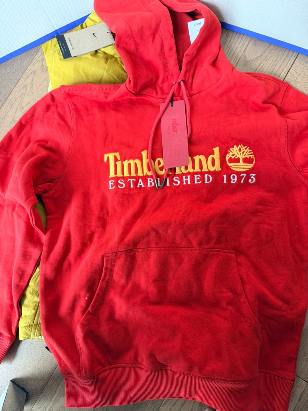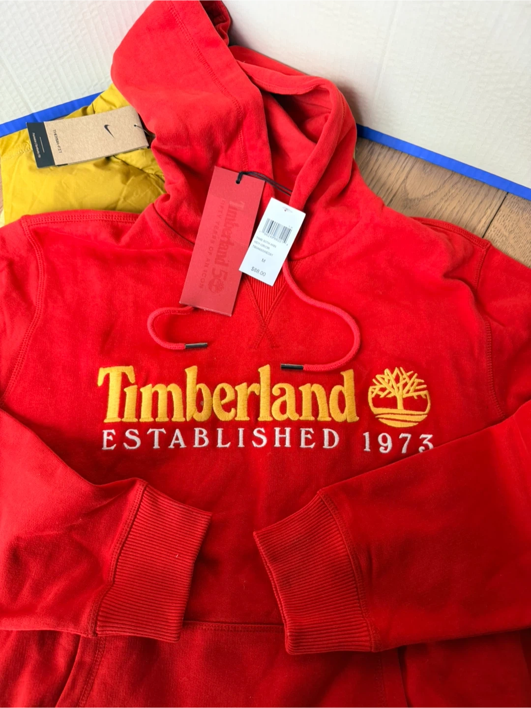 This is a red Timberland hoodie with the "Established 1973" logo. It's a size medium. Made with a comfortable cotton blend.