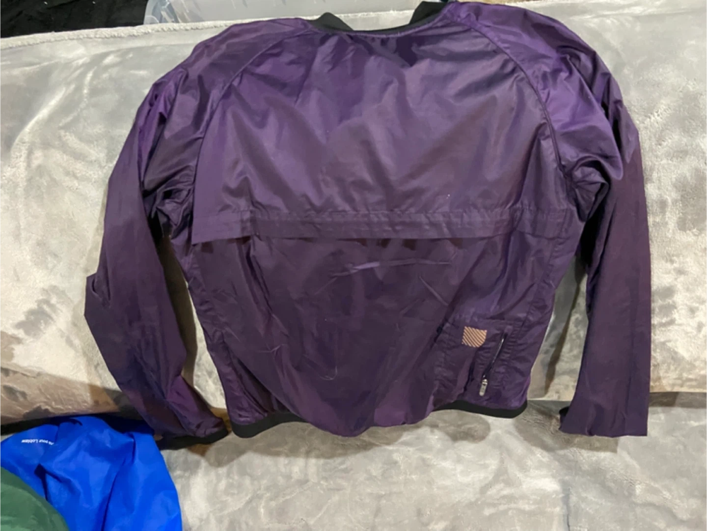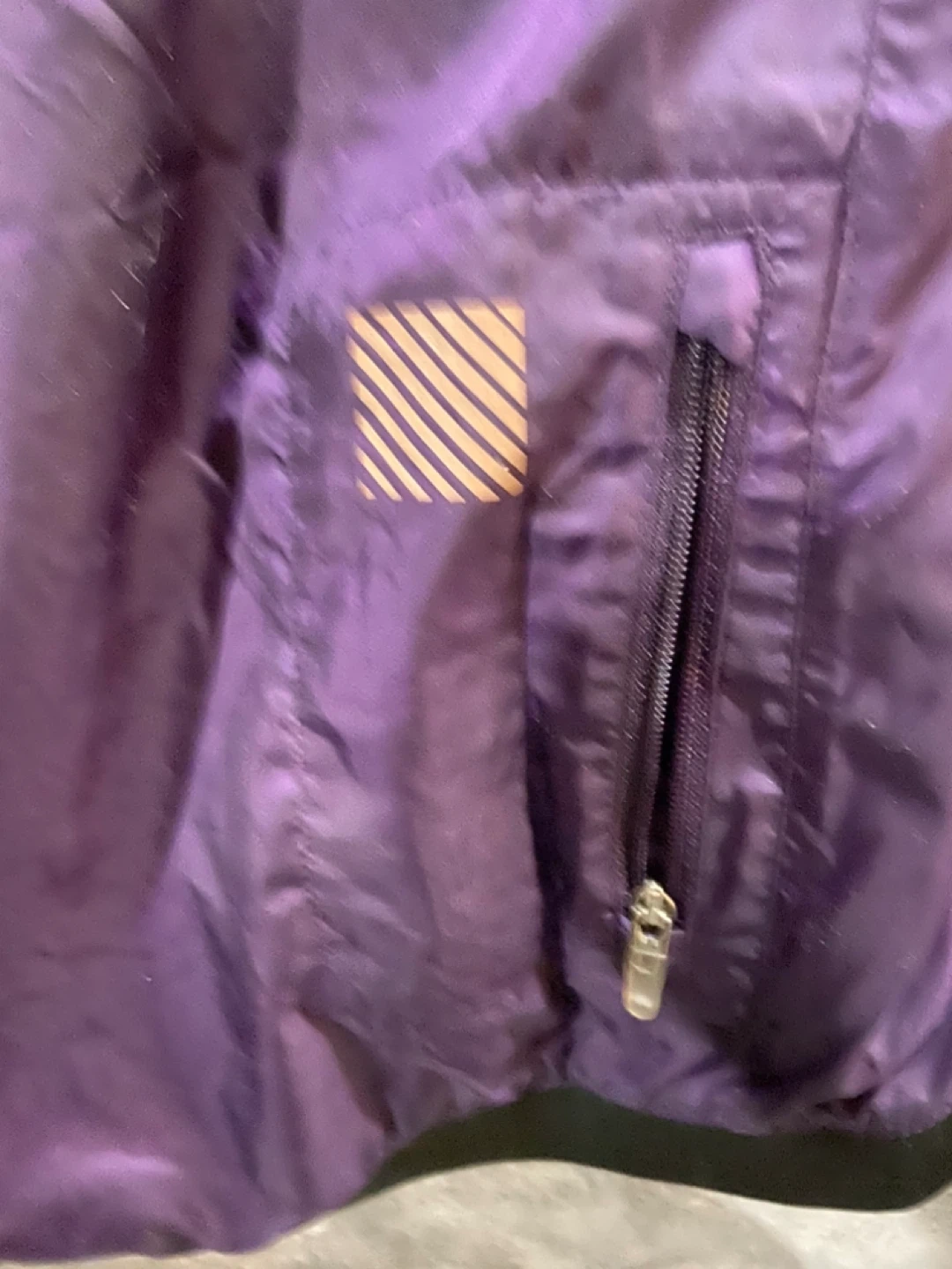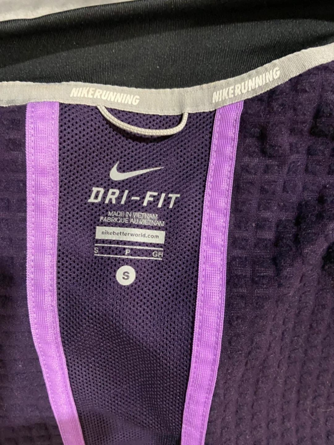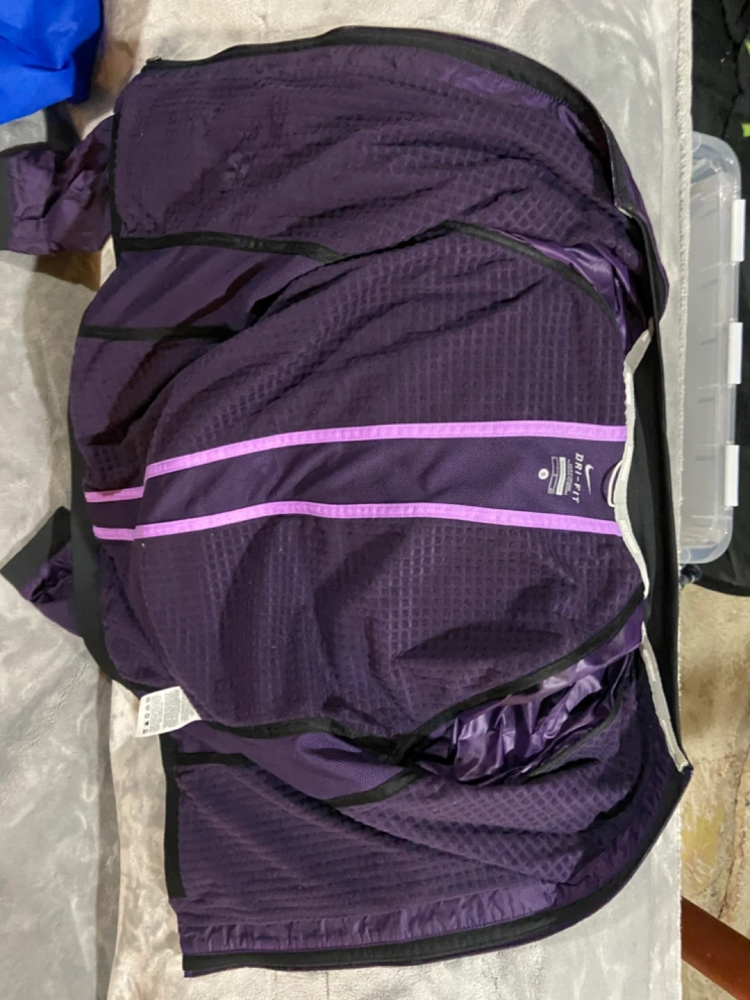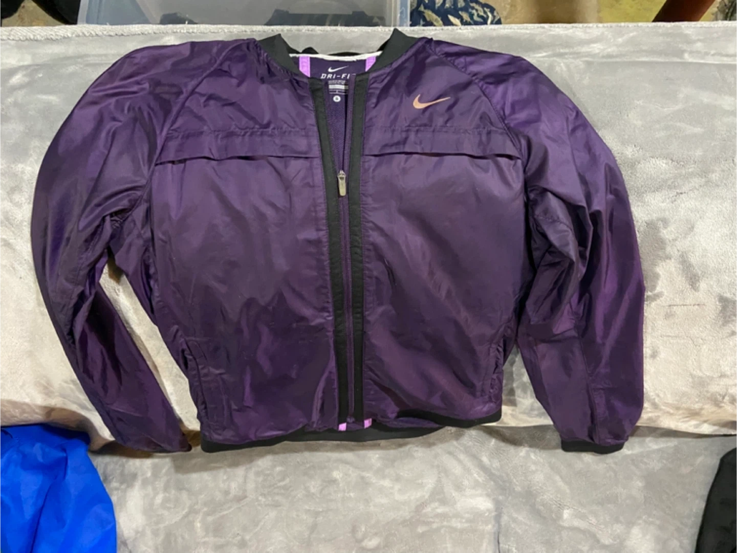 This is a purple Nike Dri-Fit running jacket. It's made in Vietnam and features a lightweight, breathable design. Includes a zippered pocket for convenience.asking 10