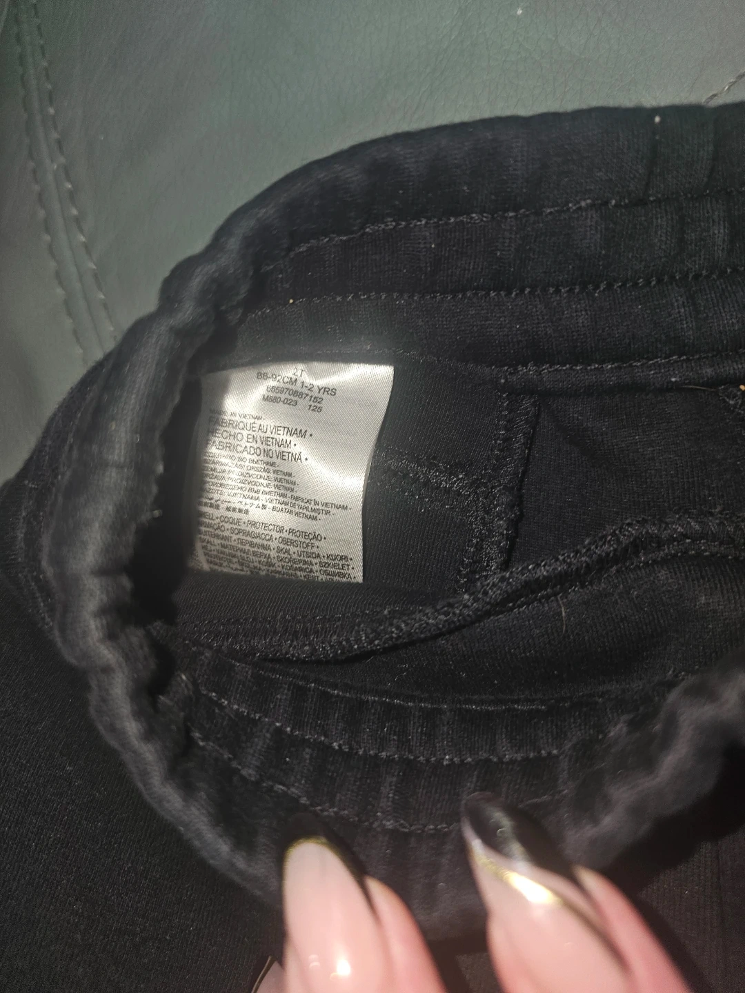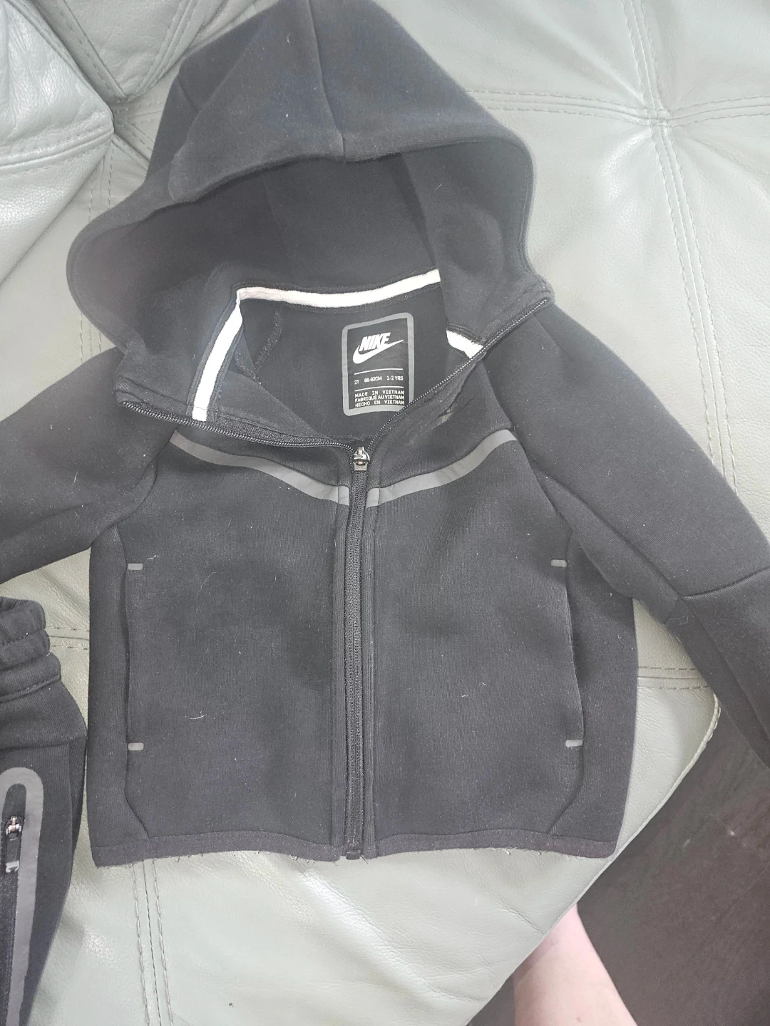 This is a black Nike Tech Fleece hoodie and matching pants set. The set is size 2T, suitable for 1-2 year olds. It's made from a soft, durable fabric.