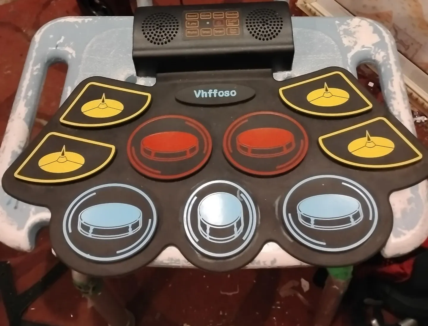 This is a Vhfoso electronic drum pad with multiple pads. It includes two red snare drum pads, three yellow cymbal pads, and three blue tom drum pads. The device has a built-in speaker and control panel.