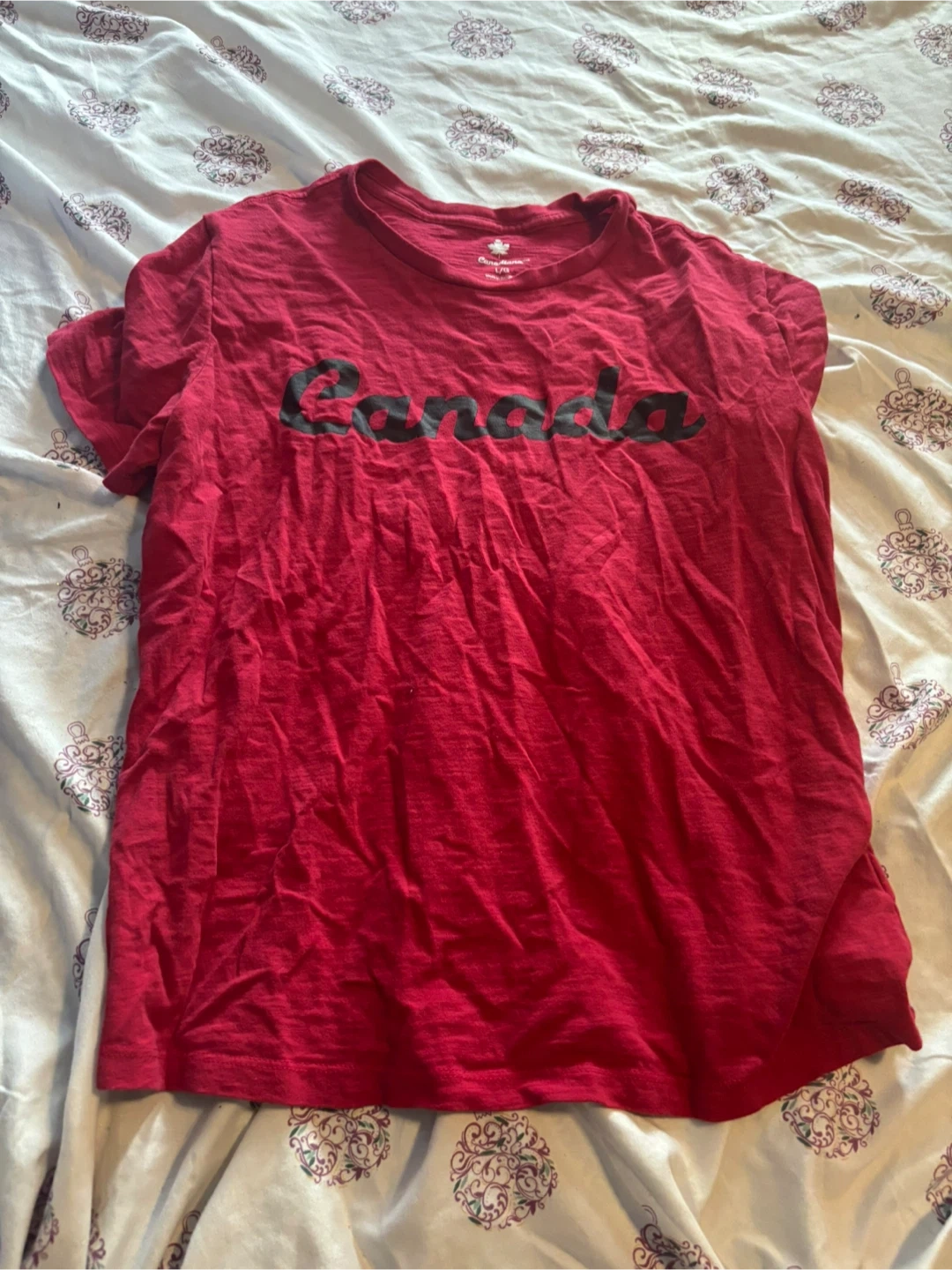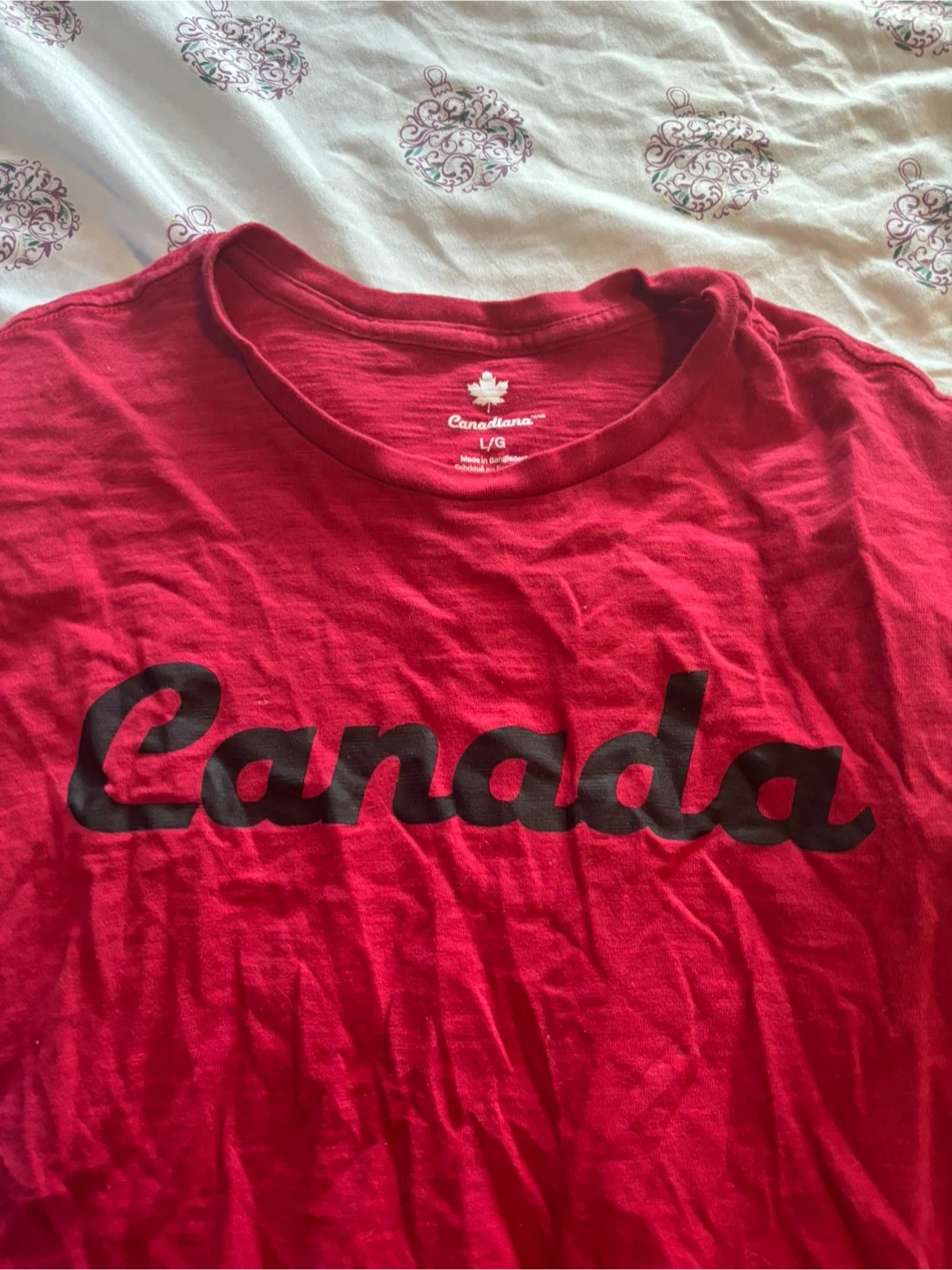 Selling a Canadiana t-shirt in size large! It's a vibrant red colour with "Canada" printed across the chest. Perfect for showing off your Canadian pride or just a casual day out