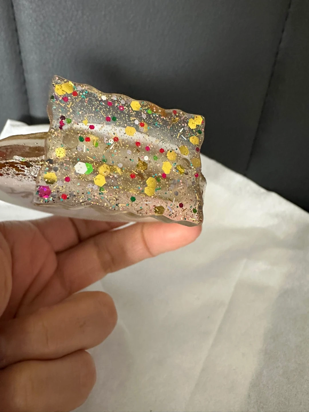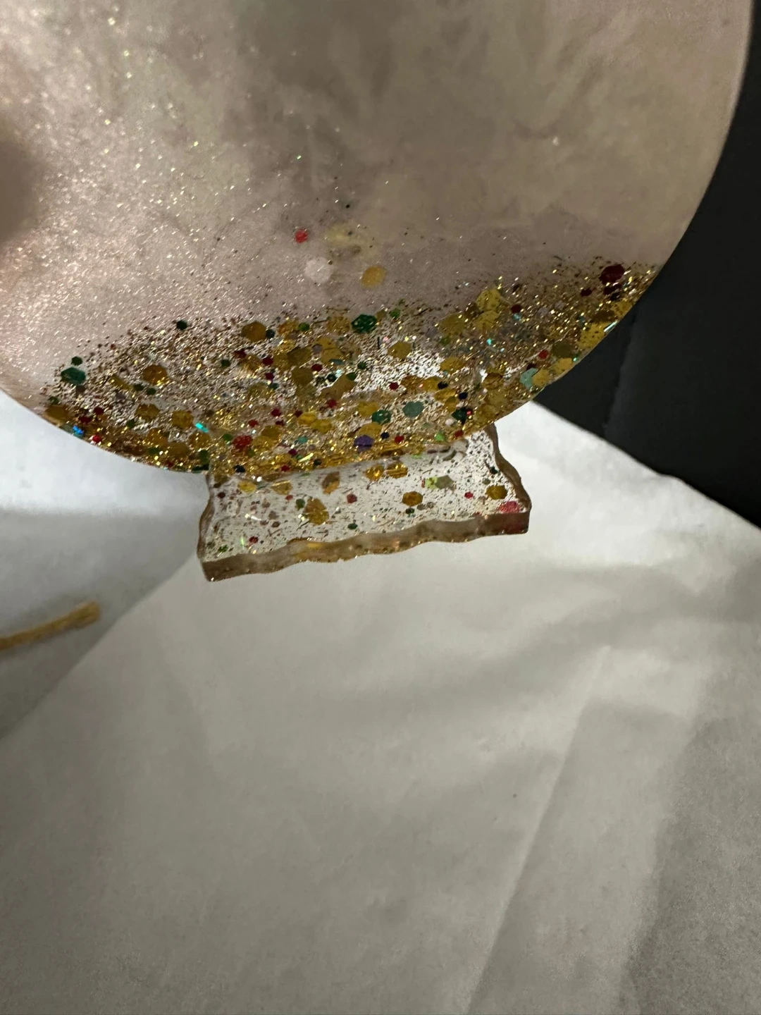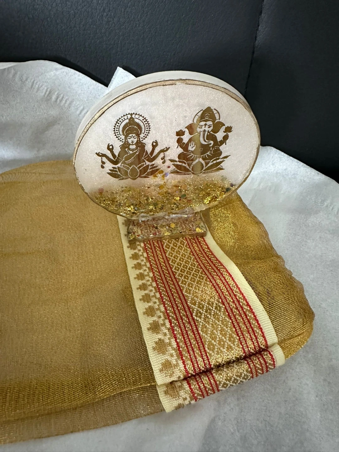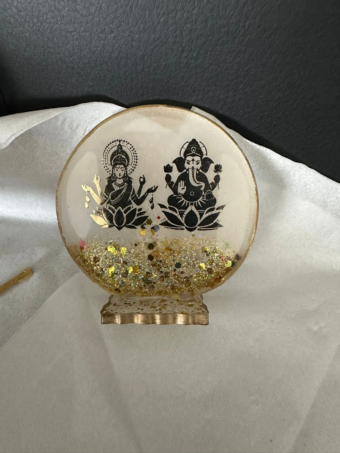 Resin figurine featuring Lakshmi and Ganesha. It contains glitter for decoration. This item could be a nice addition to your home decor.