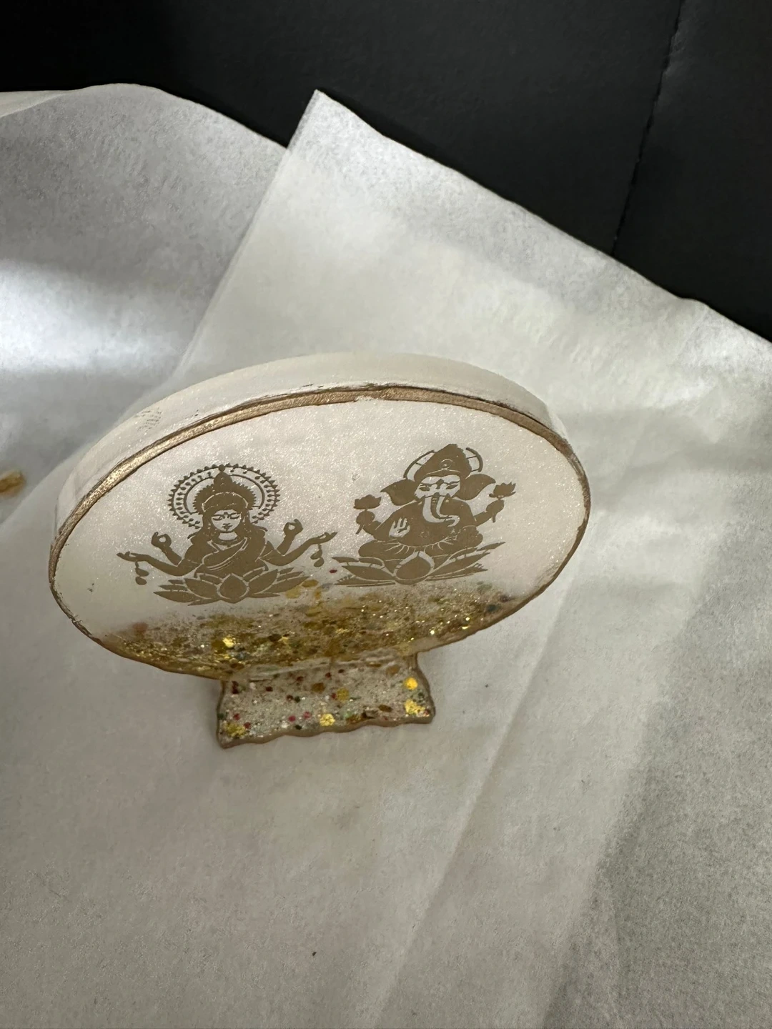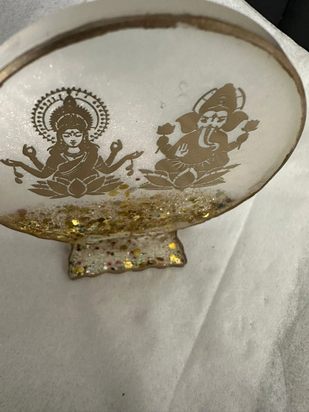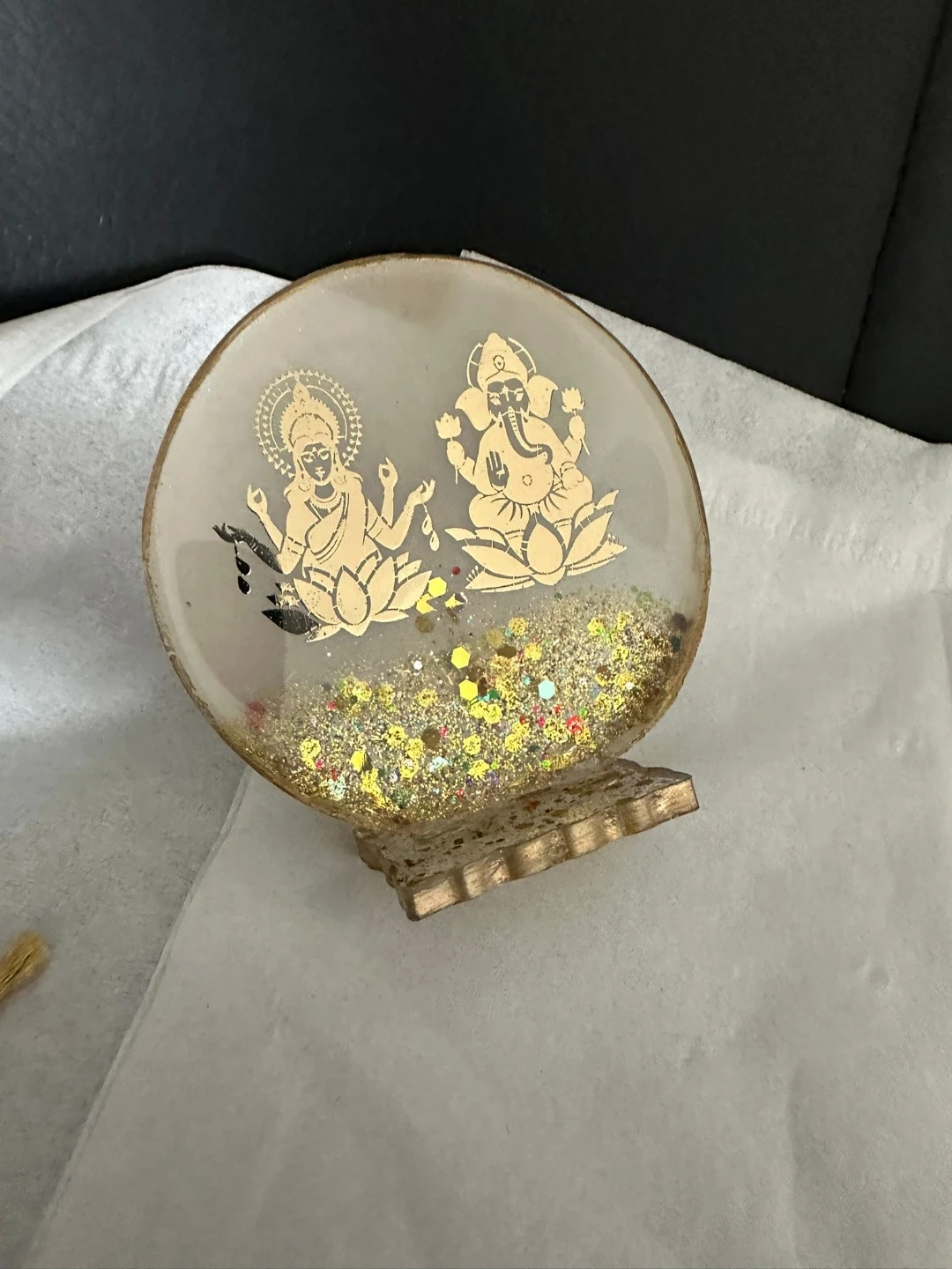 Resin figurine featuring Lakshmi and Ganesha. It contains glitter for decoration. This item could be a nice addition to your home decor.