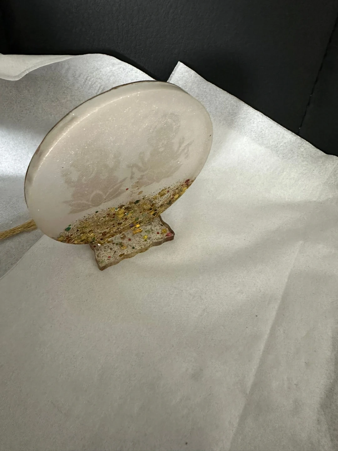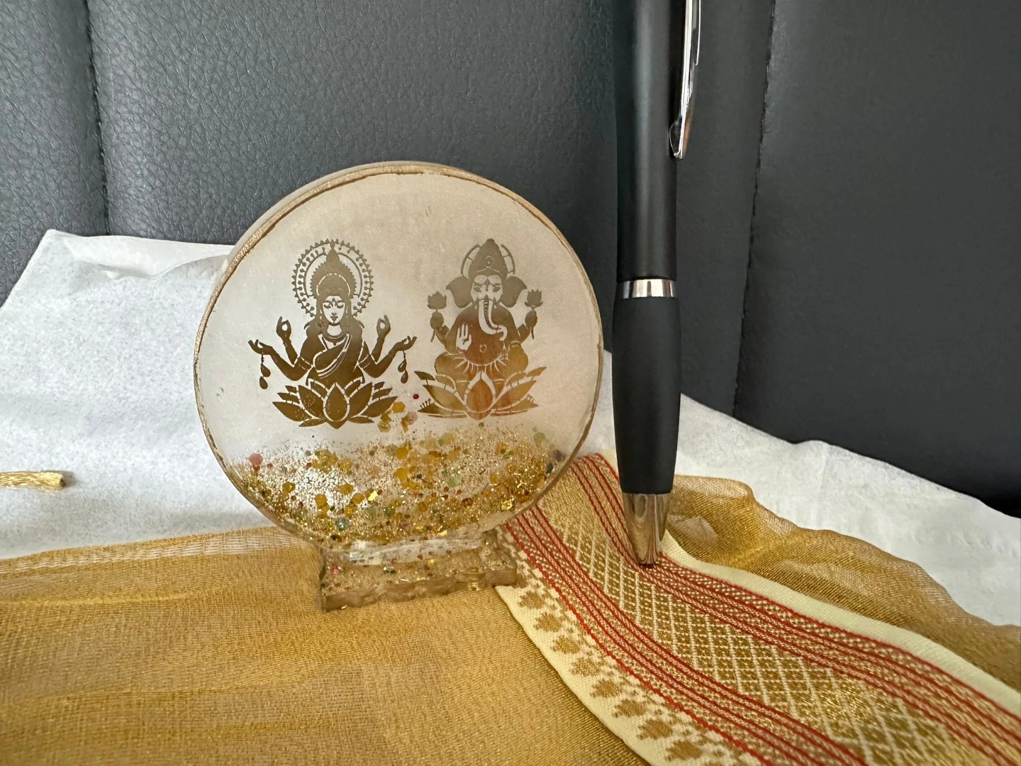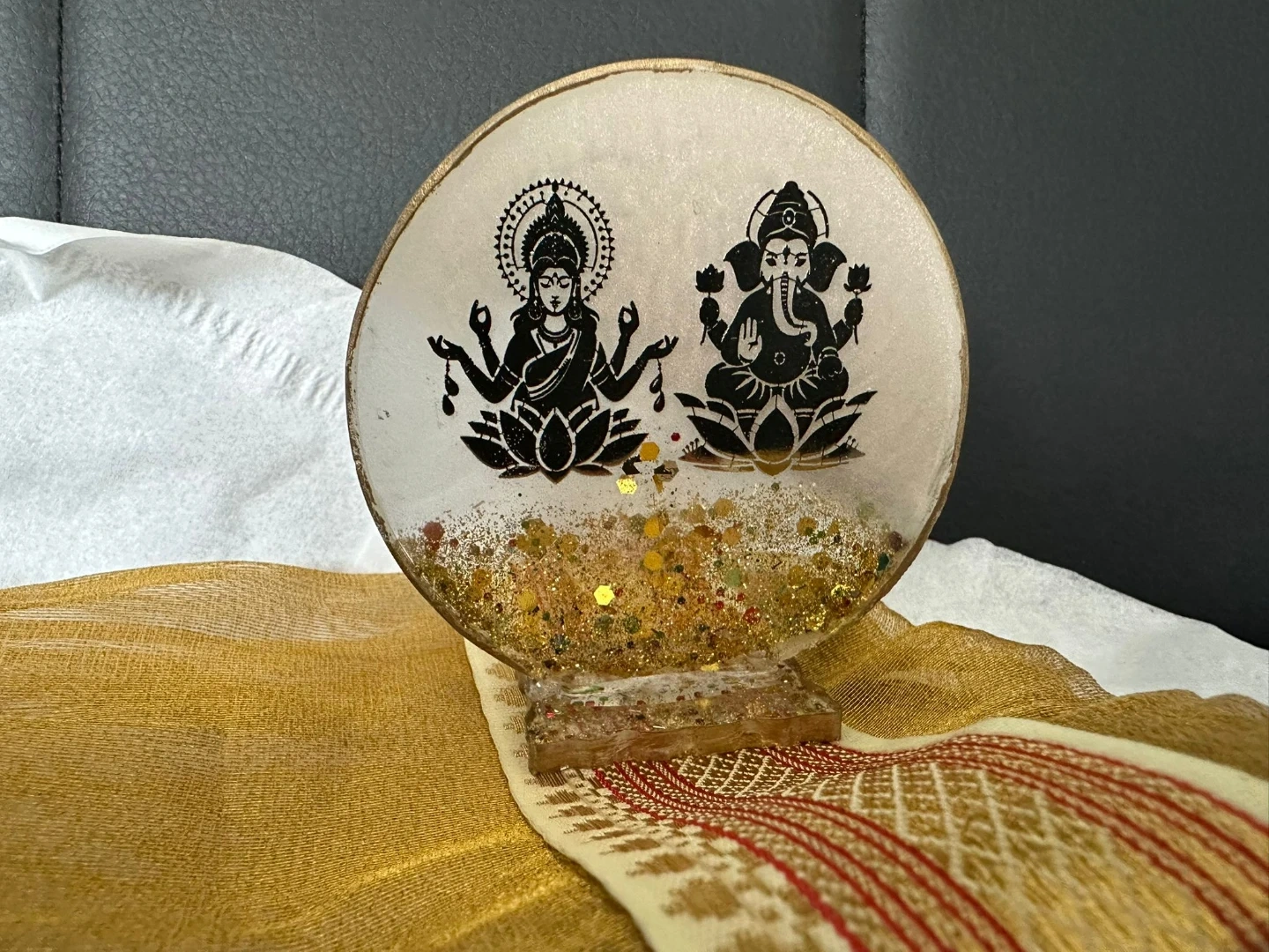 Resin figurine featuring Lakshmi and Ganesha. It contains glitter for decoration. This item could be a nice addition to your home decor.