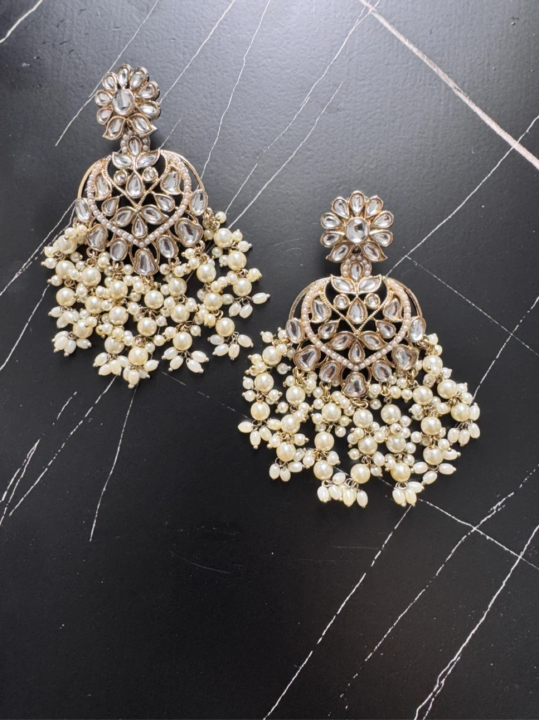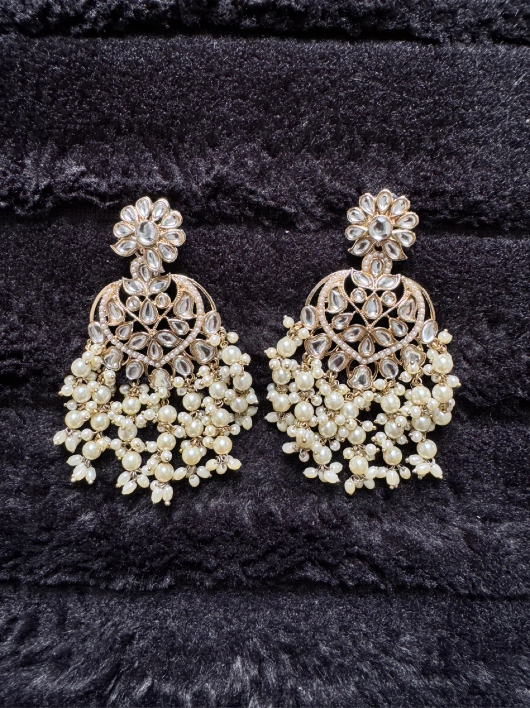 These elegant dangle earrings feature a chandelier design adorned with clear crystals and small pearls. They're designed to catch the light beautifully. These would be stunning for formal events or special occasions!