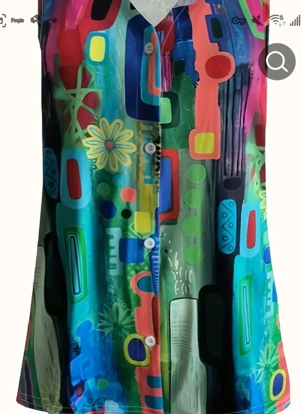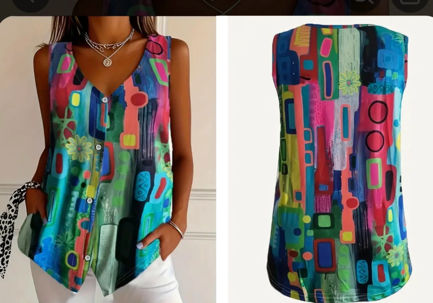 Fun and colourful abstract print sleeveless top. It's got a V-neck with button-up detail. Great for adding a pop of colour to your outfit!