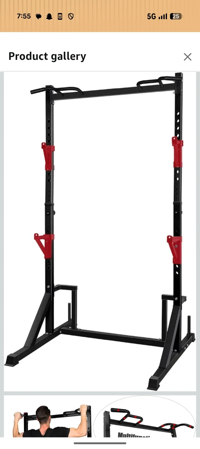 This adjustable power rack is great for home workouts! It features a multifunctional pull-up bar and adjustable barbell supports. The main frame height is also adjustable. Get your fitness on at home!