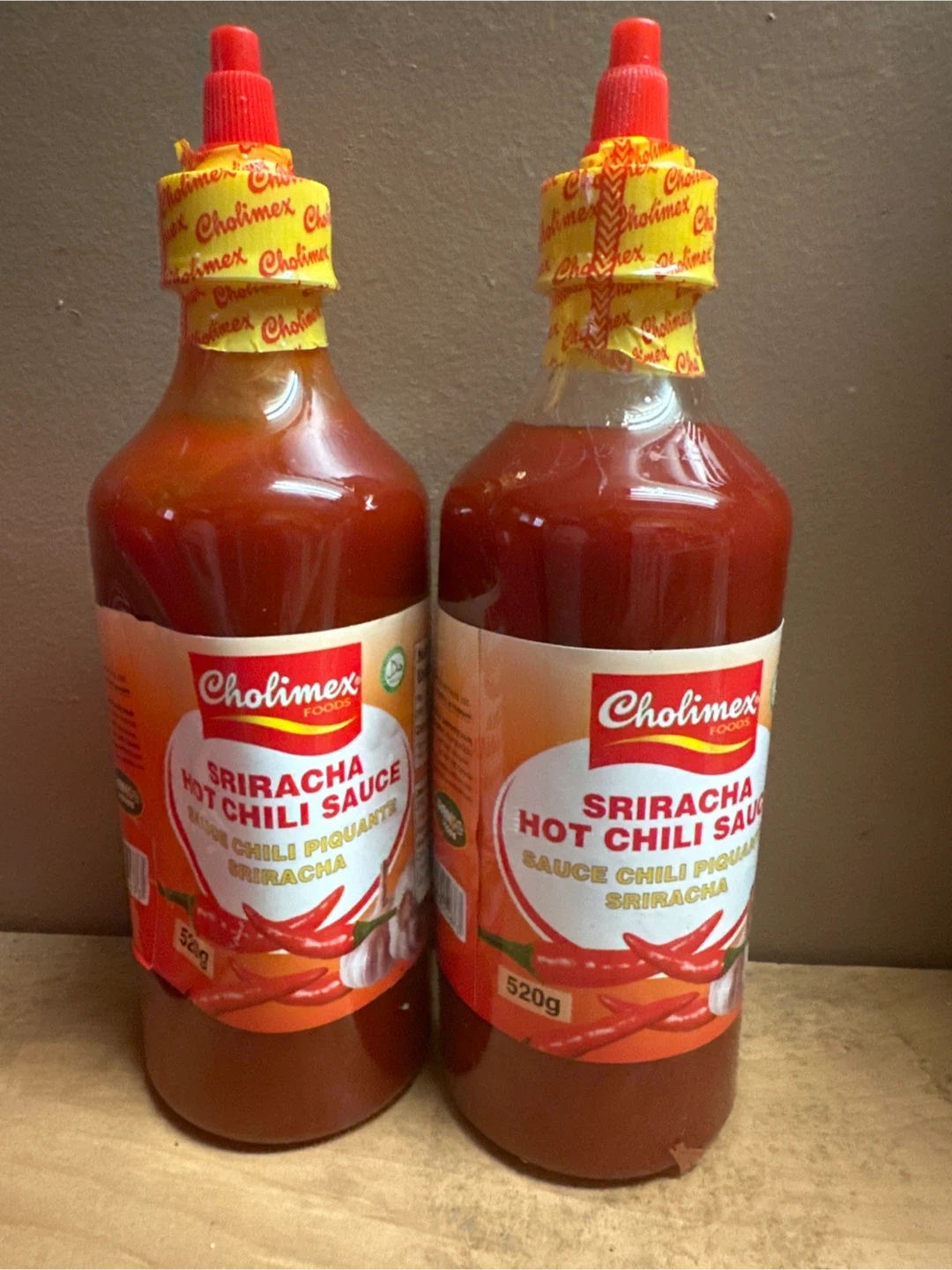 Two bottles of Cholimex Sriracha Hot Chili Sauce. Each bottle is 520g. It's a spicy chili sauce made with chilies and garlic.
