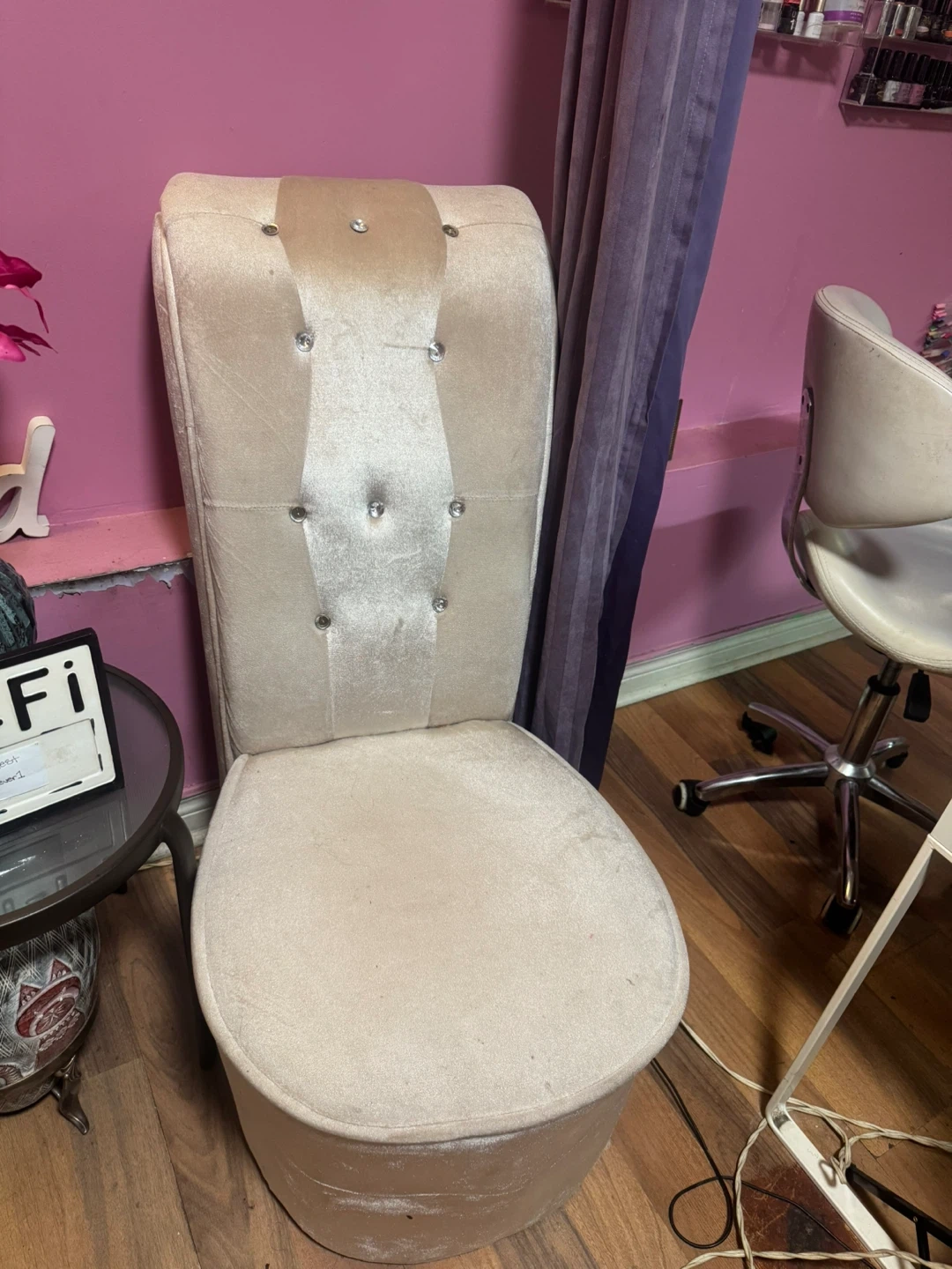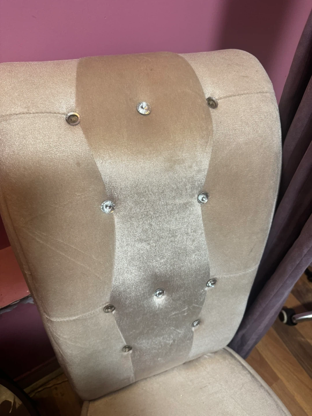 This is a lovely tufted velvet accent chair. It's upholstered in a soft beige velvet fabric with diamond-tufted detailing and faux crystal accents. It's a stylish addition to any room!