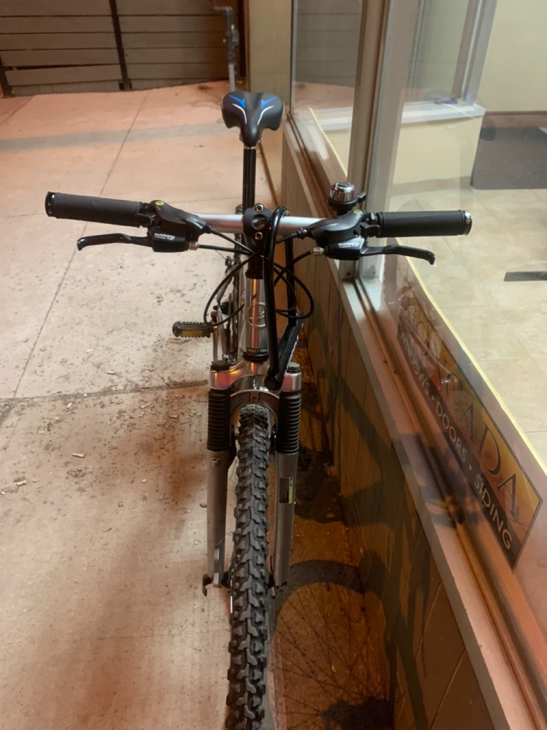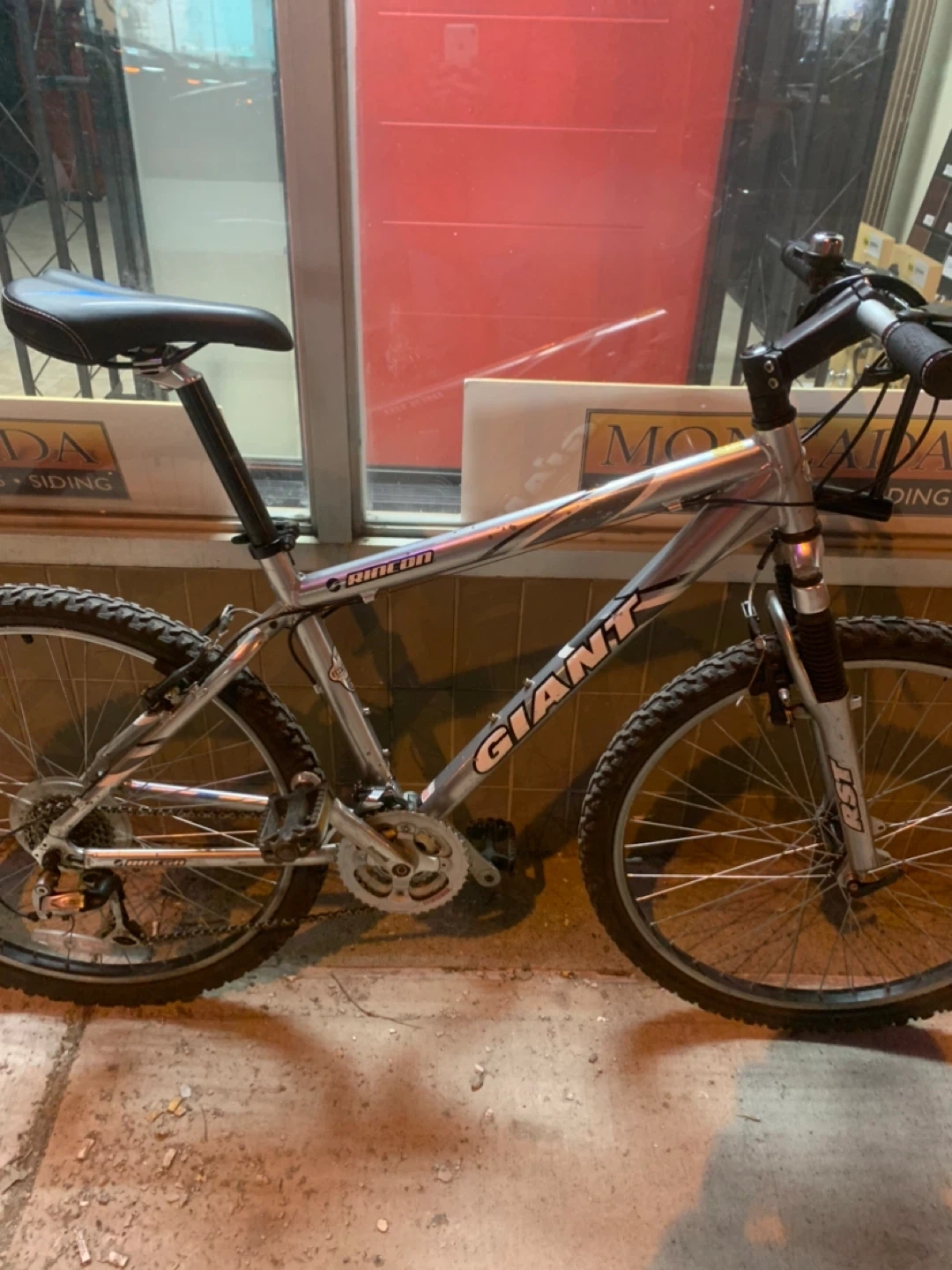 This is a silver Giant mountain bike with front suspension. It has disc brakes and a Shimano gear system. It's ready for your next adventure!