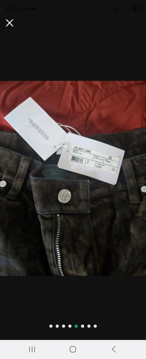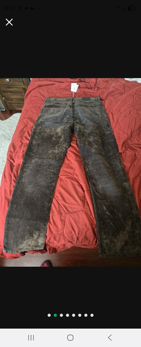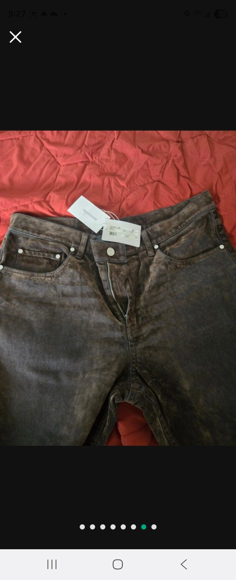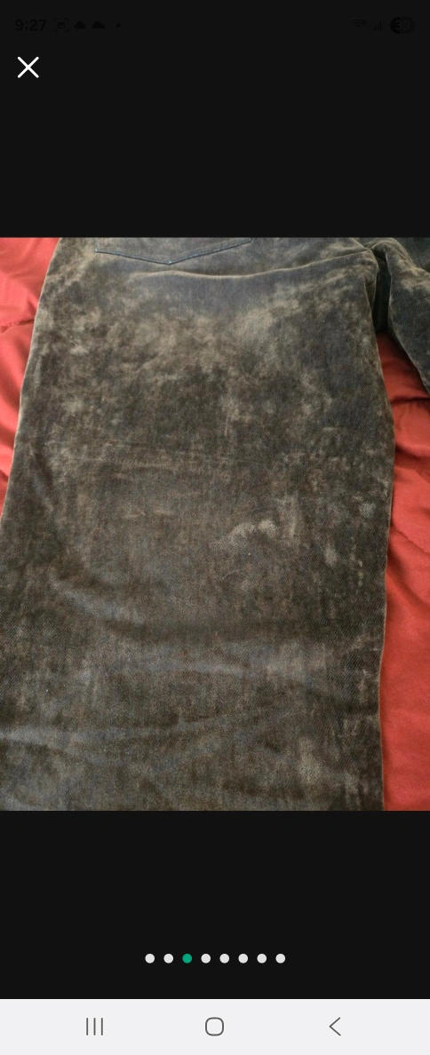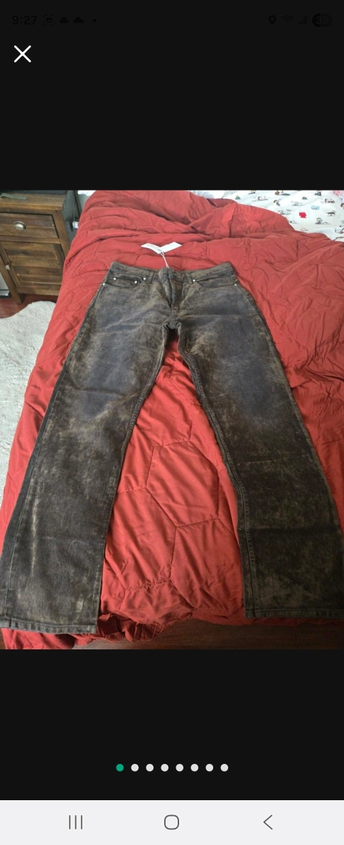 These denim jeans have a stone-washed effect, a dark wash. Button closure, with a zipper fly. These jeans can add a unique touch to your everyday look.