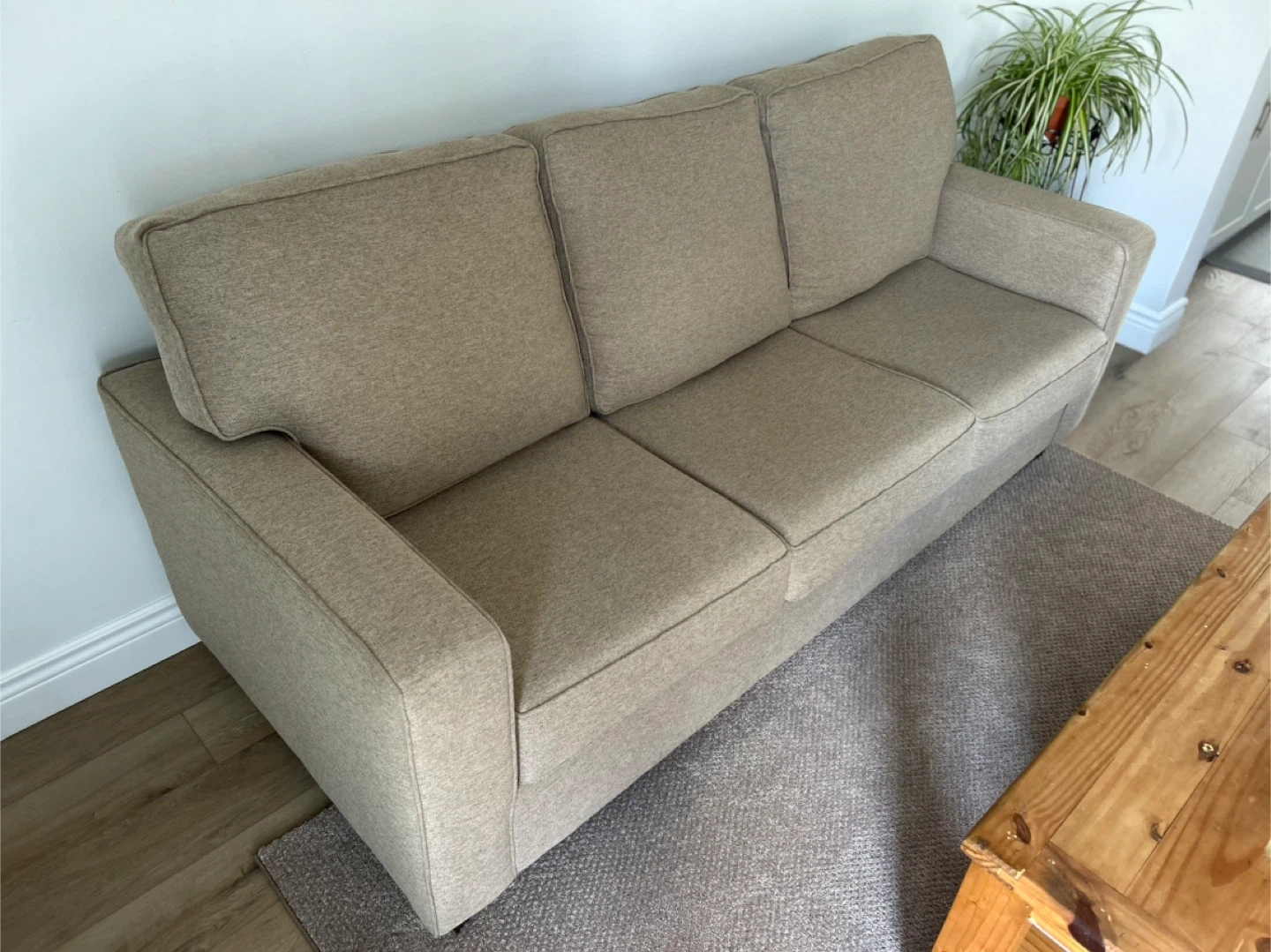 This is a beige three-seater sofa. It has a durable fabric upholstery and comfortable seating. The neutral colour makes it a versatile addition to any living space.
