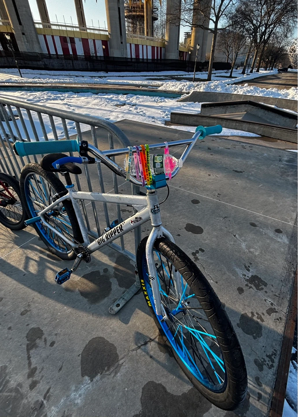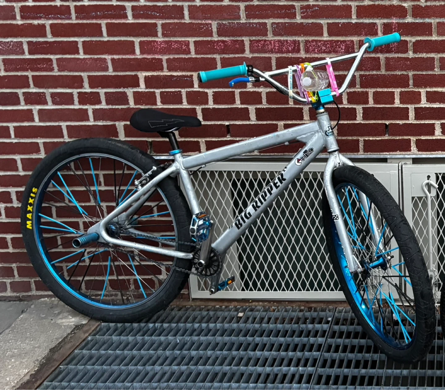 SE Bikes Big Ripper 29er BMX bike in silver. It's got blue rims and handlebars. Features a sturdy frame and comfortable seat. Perfect for cruising! 500 OBO negotiable!!!