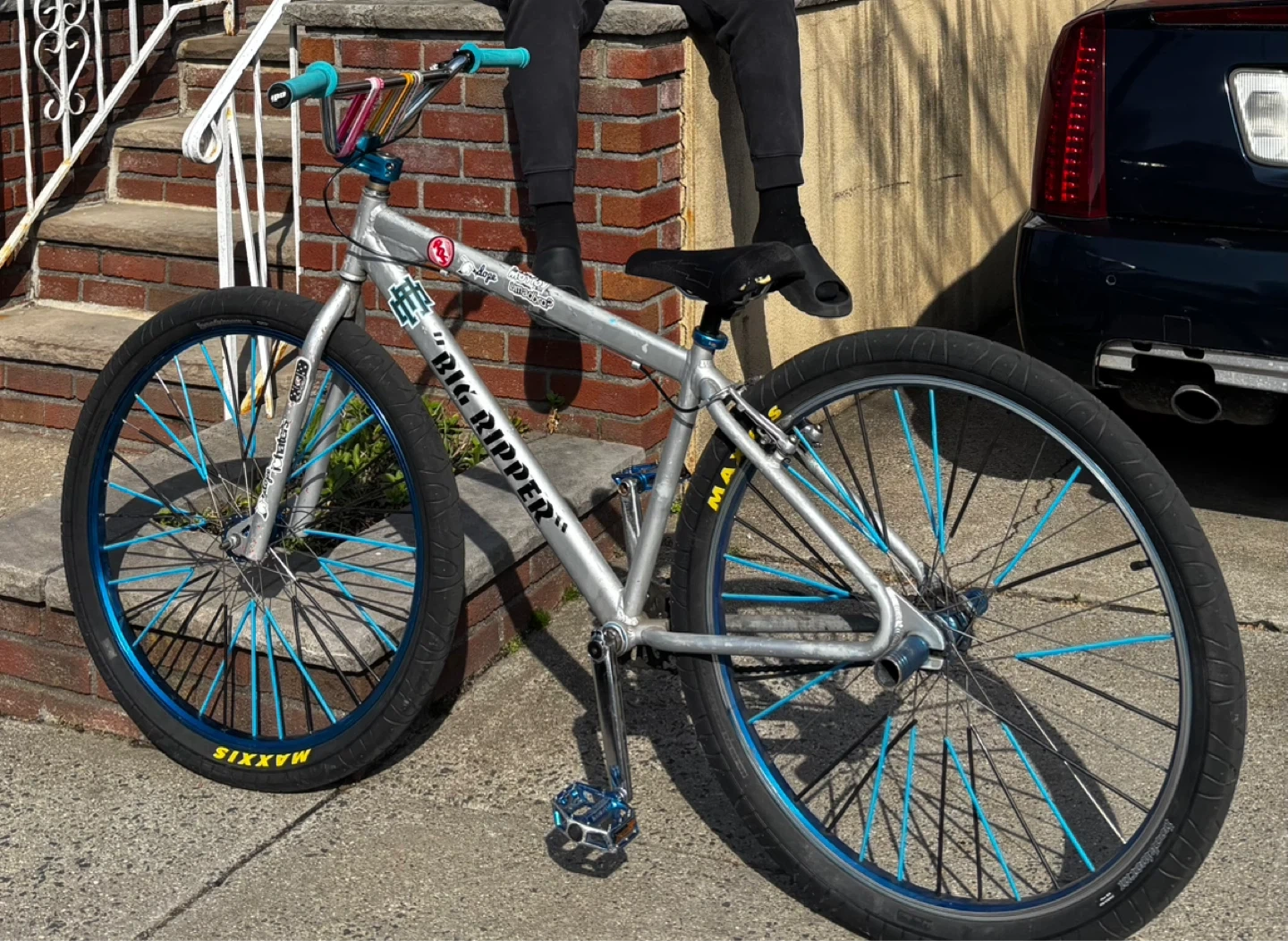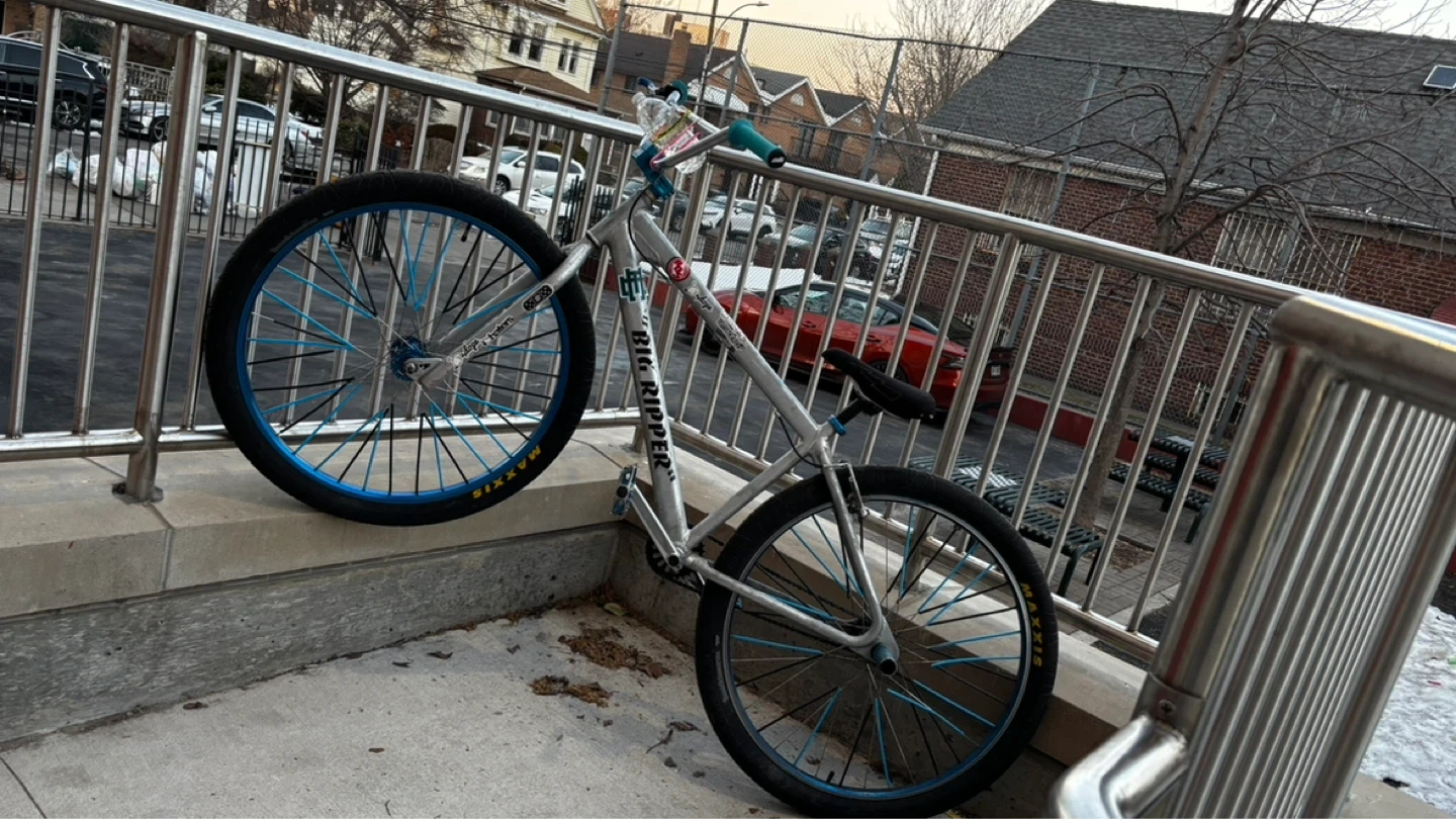 SE Bikes Big Ripper 29er BMX bike in silver. It's got blue rims and handlebars. Features a sturdy frame and comfortable seat. Perfect for cruising! 500 OBO negotiable!!!