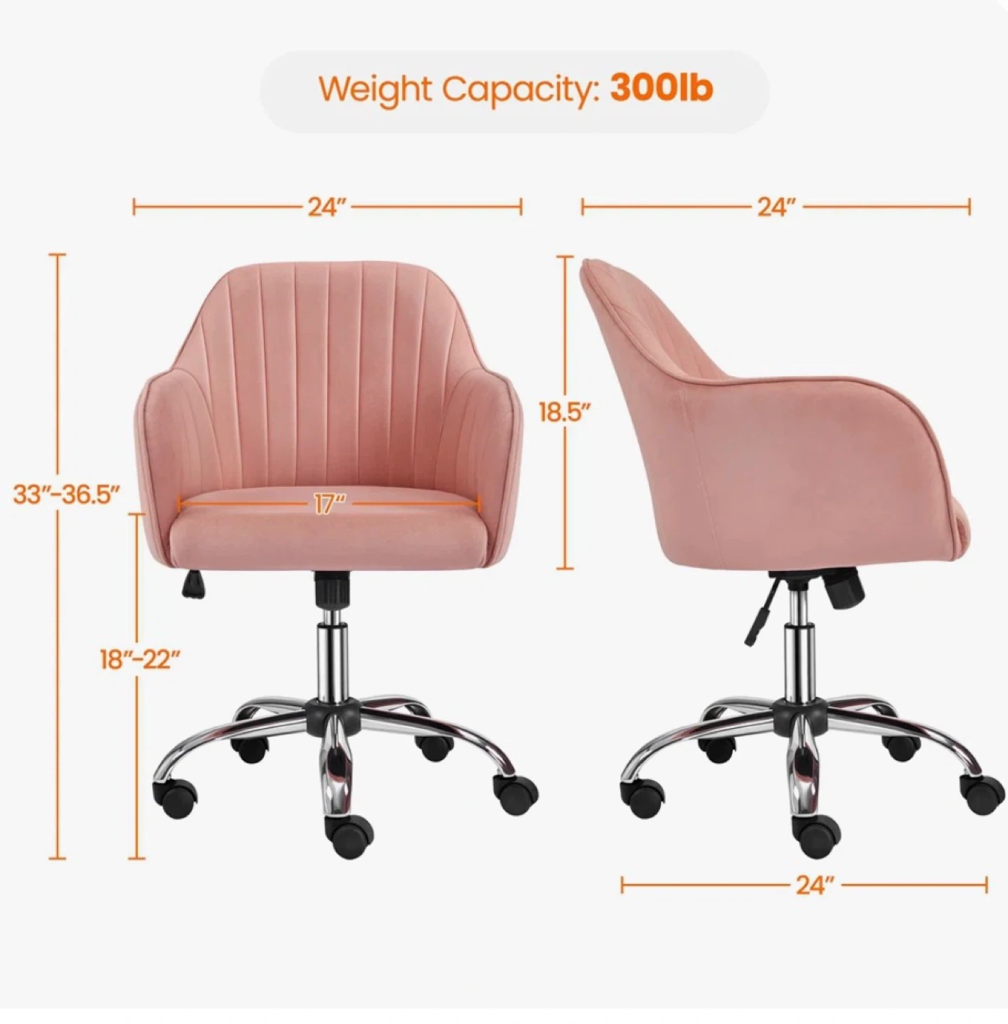 This pink velvet office chair offers adjustable height from 18"-22". It's 24" wide and has a 300lb weight capacity. The chair's seat height is 17". A perfect addition to your office or home desk.