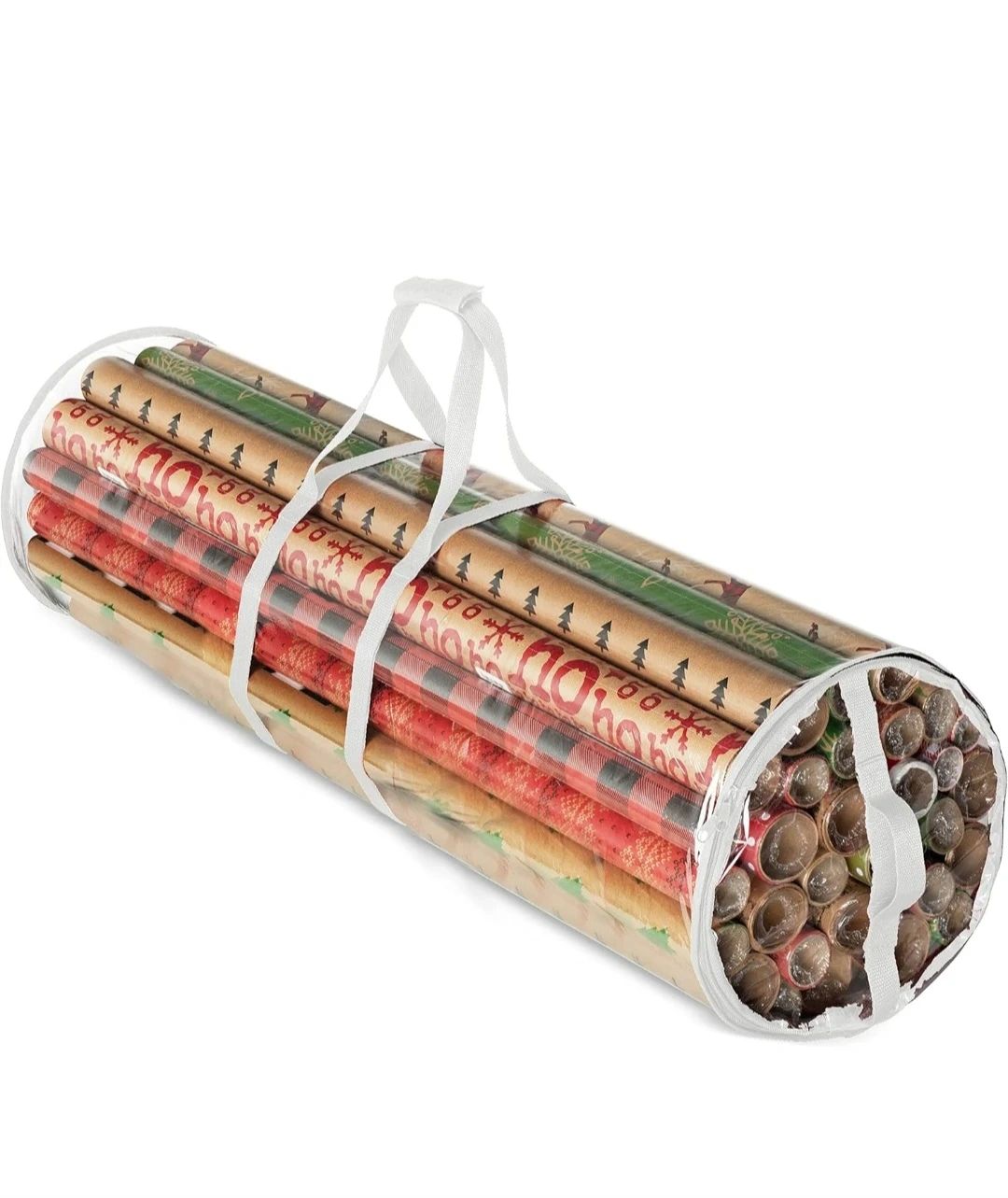 Selling a Christmas wrapping paper storage bag. It's designed to hold rolls of wrapping paper and has handles for easy transport. Measures 41 inches long and 11.2 inches in diameter when full. Keeps your wrapping paper tidy!