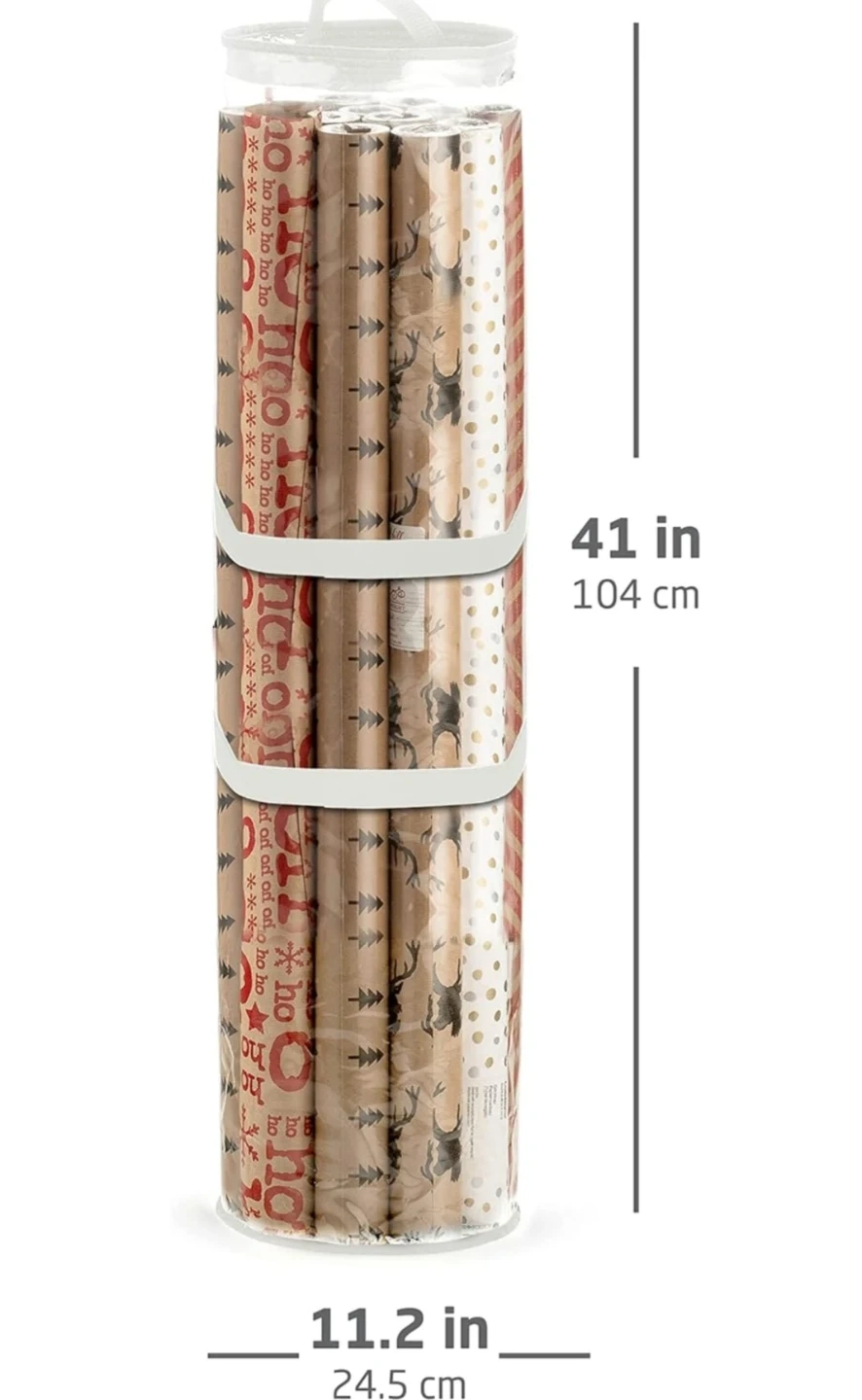 Selling a Christmas wrapping paper storage bag. It's designed to hold rolls of wrapping paper and has handles for easy transport. Measures 41 inches long and 11.2 inches in diameter when full. Keeps your wrapping paper tidy!