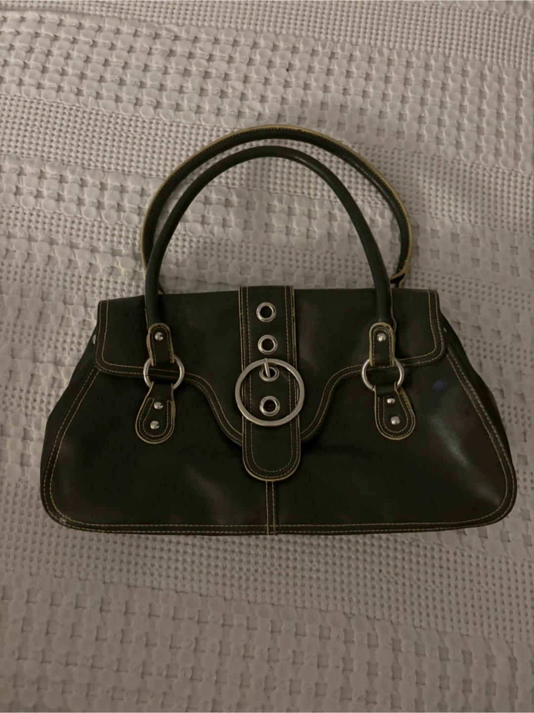 Selling a vintage handbag in an olive green colour. It has a unique design with silver hardware and a structured shape. It's in great condition, has a spacious interior, and perfect for adding a retro touch to your outfit!