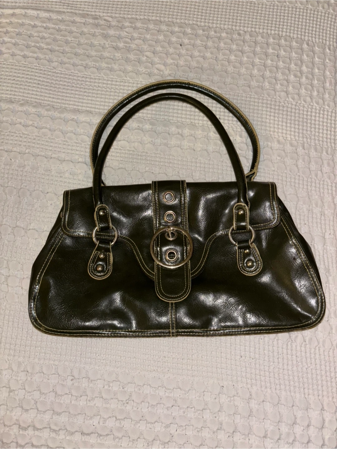 Selling a vintage handbag in an olive green colour. It has a unique design with silver hardware and a structured shape. It's in great condition, has a spacious interior, and perfect for adding a retro touch to your outfit!