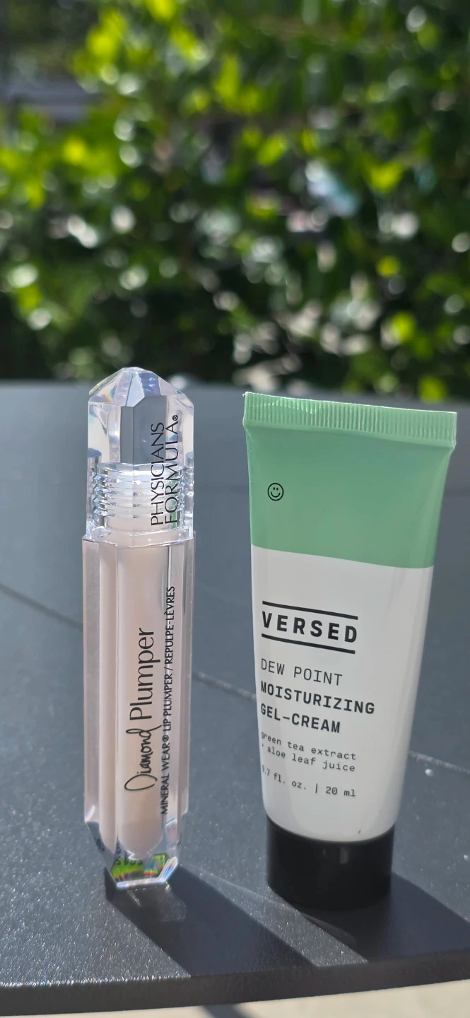 This is Physicians Formula Diamond Plumper lip gloss in Light Pink Princess. It's 3ml or 0.1 Fl. Oz. For plumping lips. And Versed moisturizer.