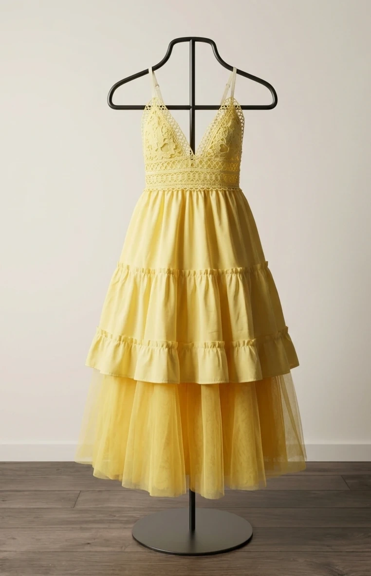 This sundress features a yellow tiered design with delicate lace detailing on the bodice. It has spaghetti straps and a playful bow accent at the back. Made for warm-weather occasions!