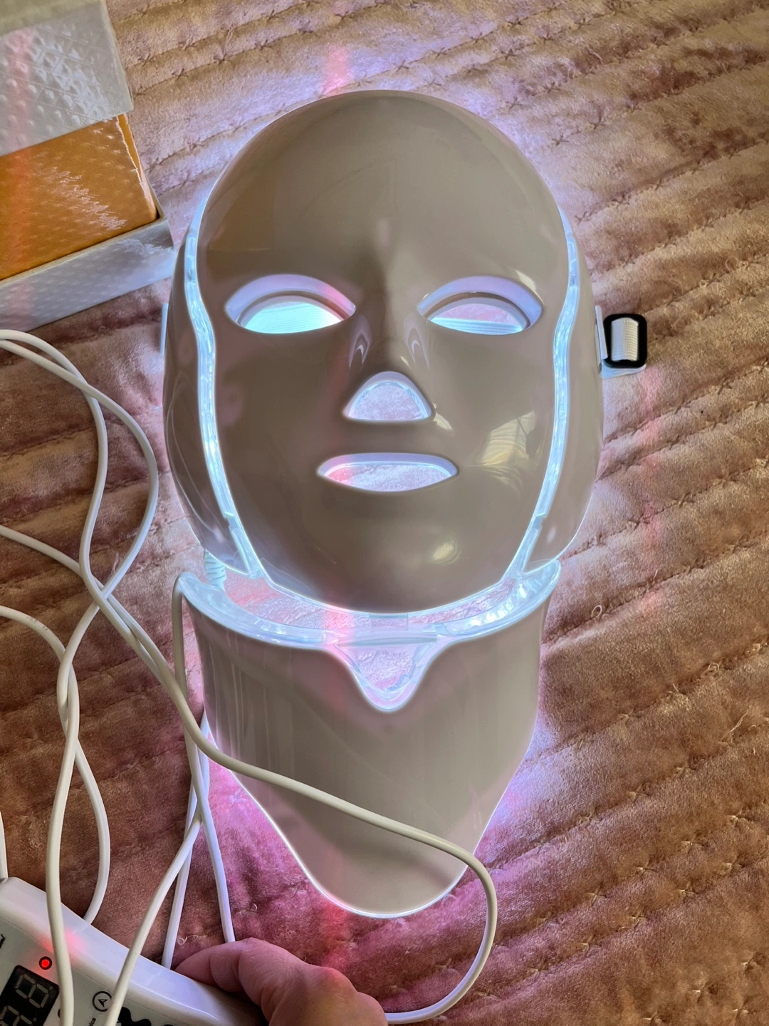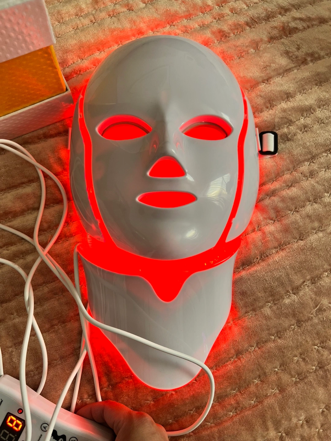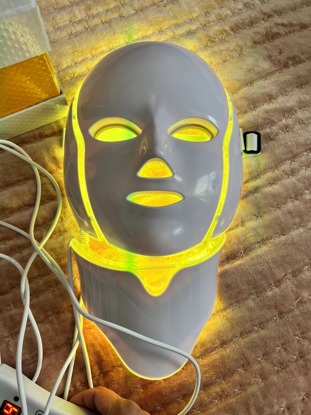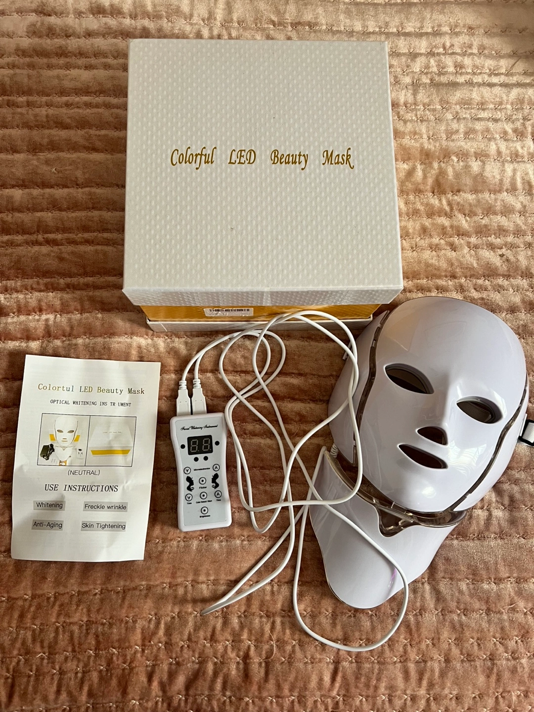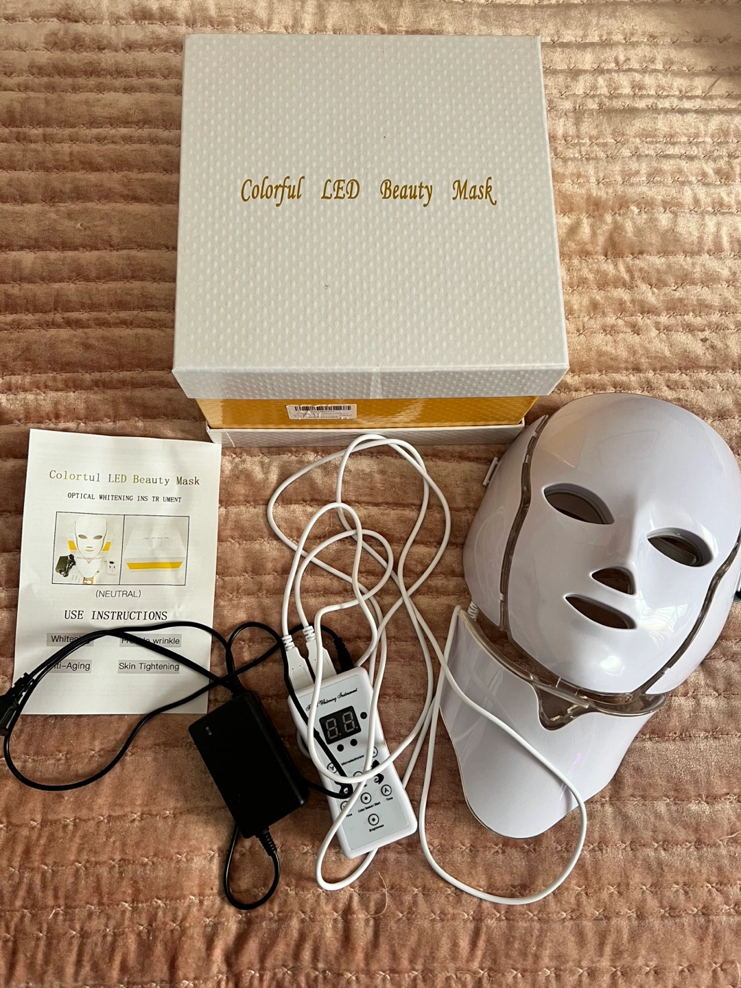 LED light therapy mask. Includes control unit and power adapter. Multiple color settings. Whitening, anti-aging, freckle, wrinkle treatments.