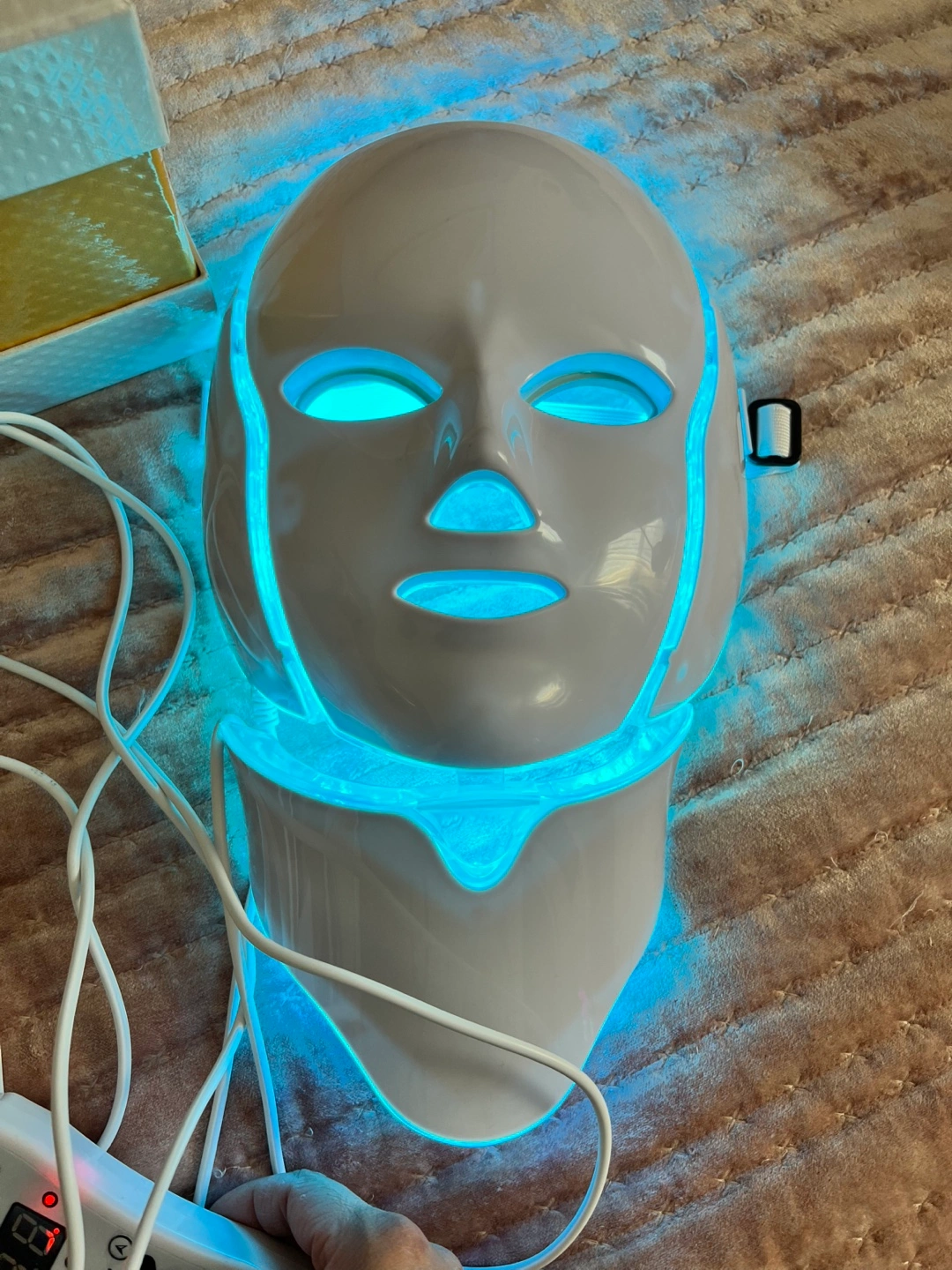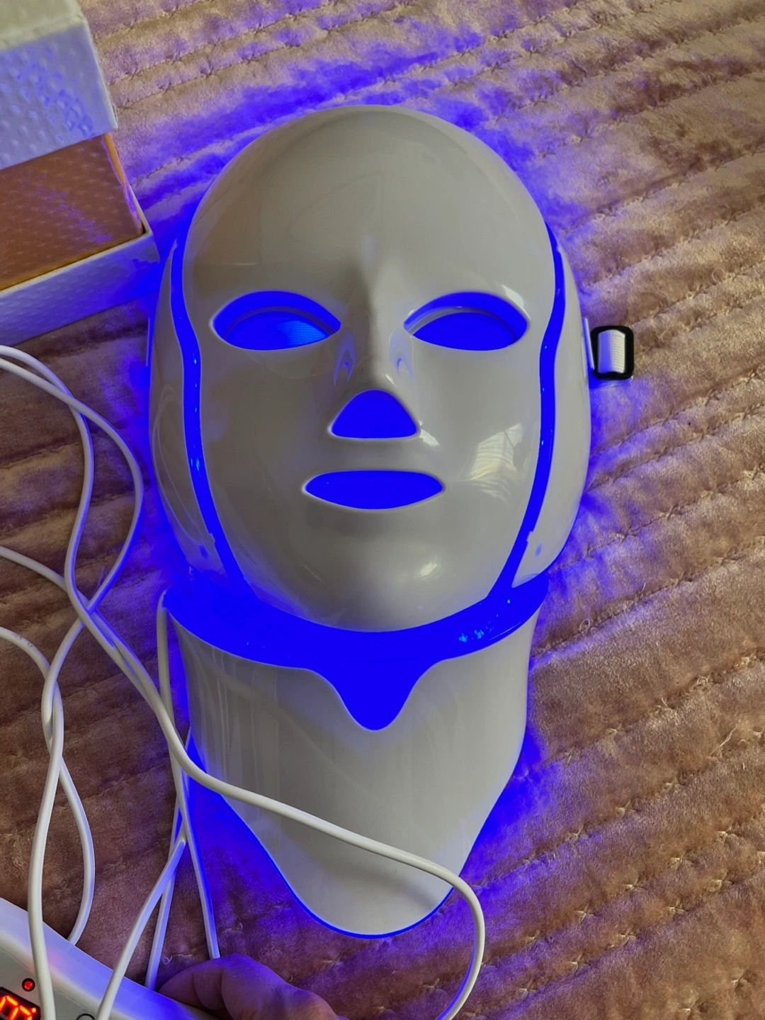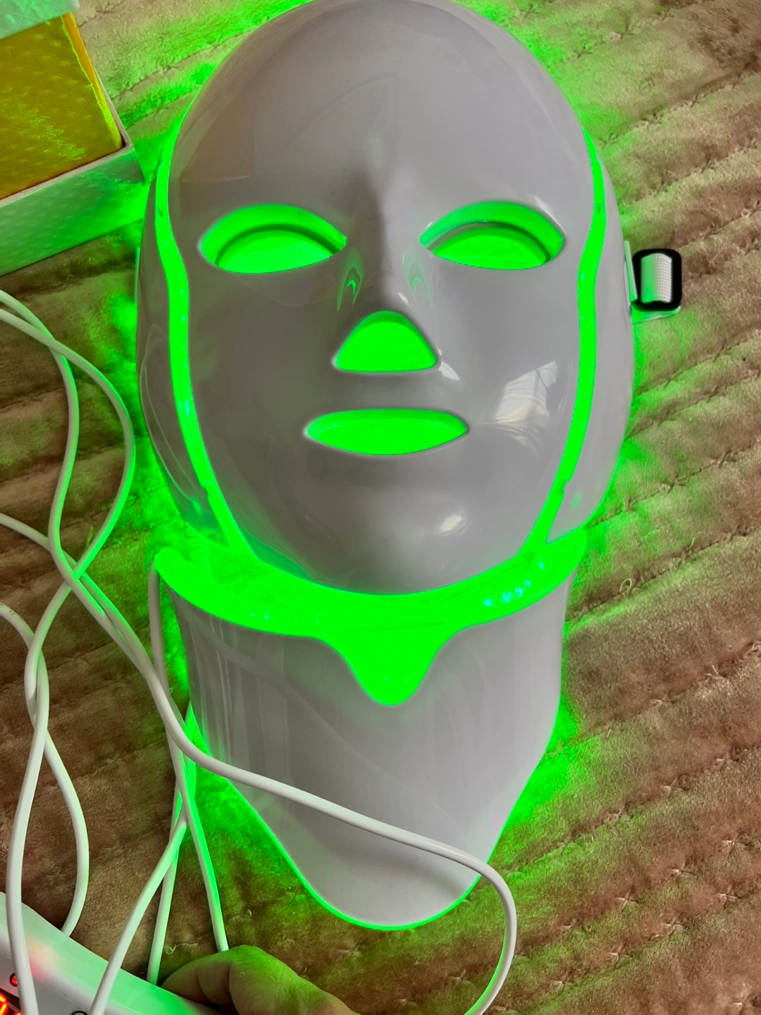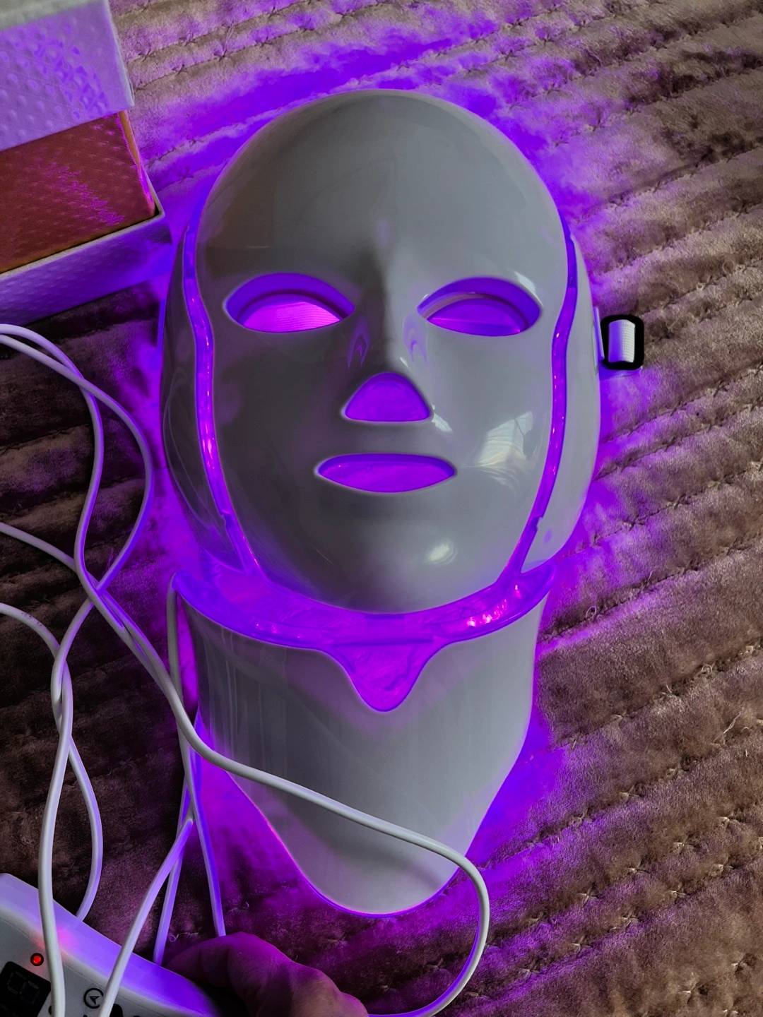 LED light therapy mask. Includes control unit and power adapter. Multiple color settings. Whitening, anti-aging, freckle, wrinkle treatments.