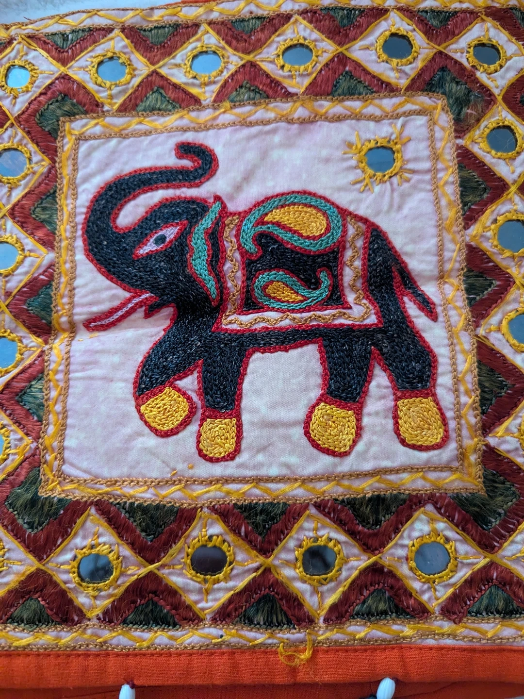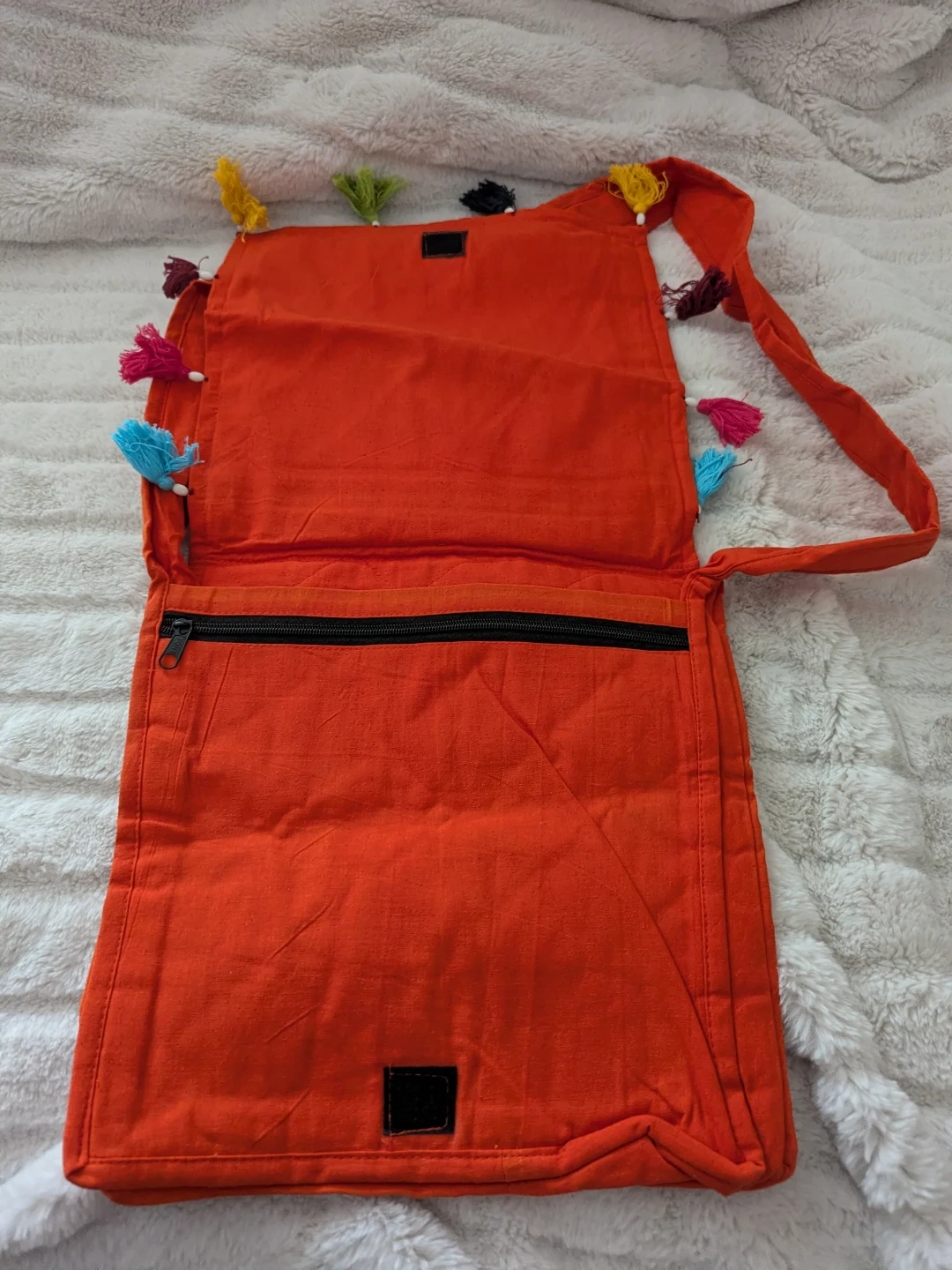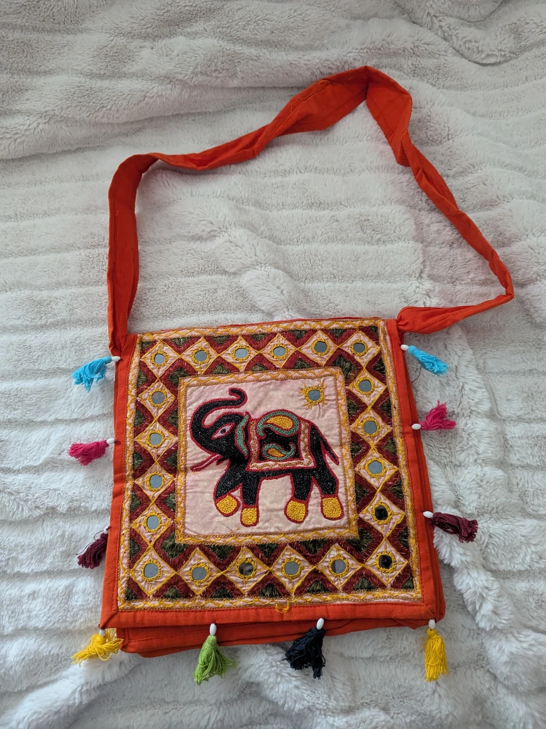 Brand new orange Bohemian sling bag features intricate embroidery of an elephant with colourful tassels. It has a zippered compartment and a long strap for easy carrying
