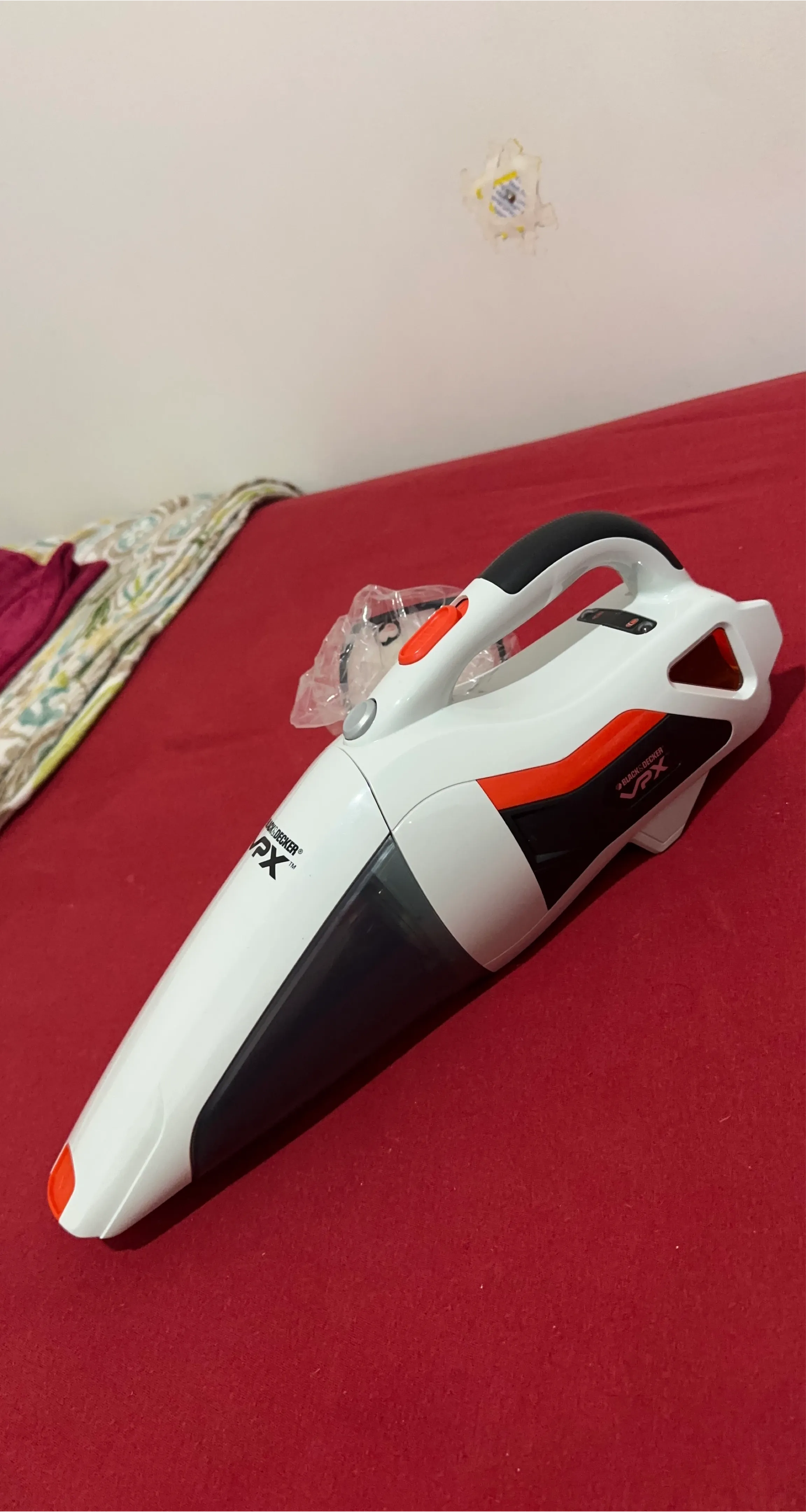This is a BLACK+DECKER VPX handheld vacuum. It's white, black, and orange. Comes with a charging base.