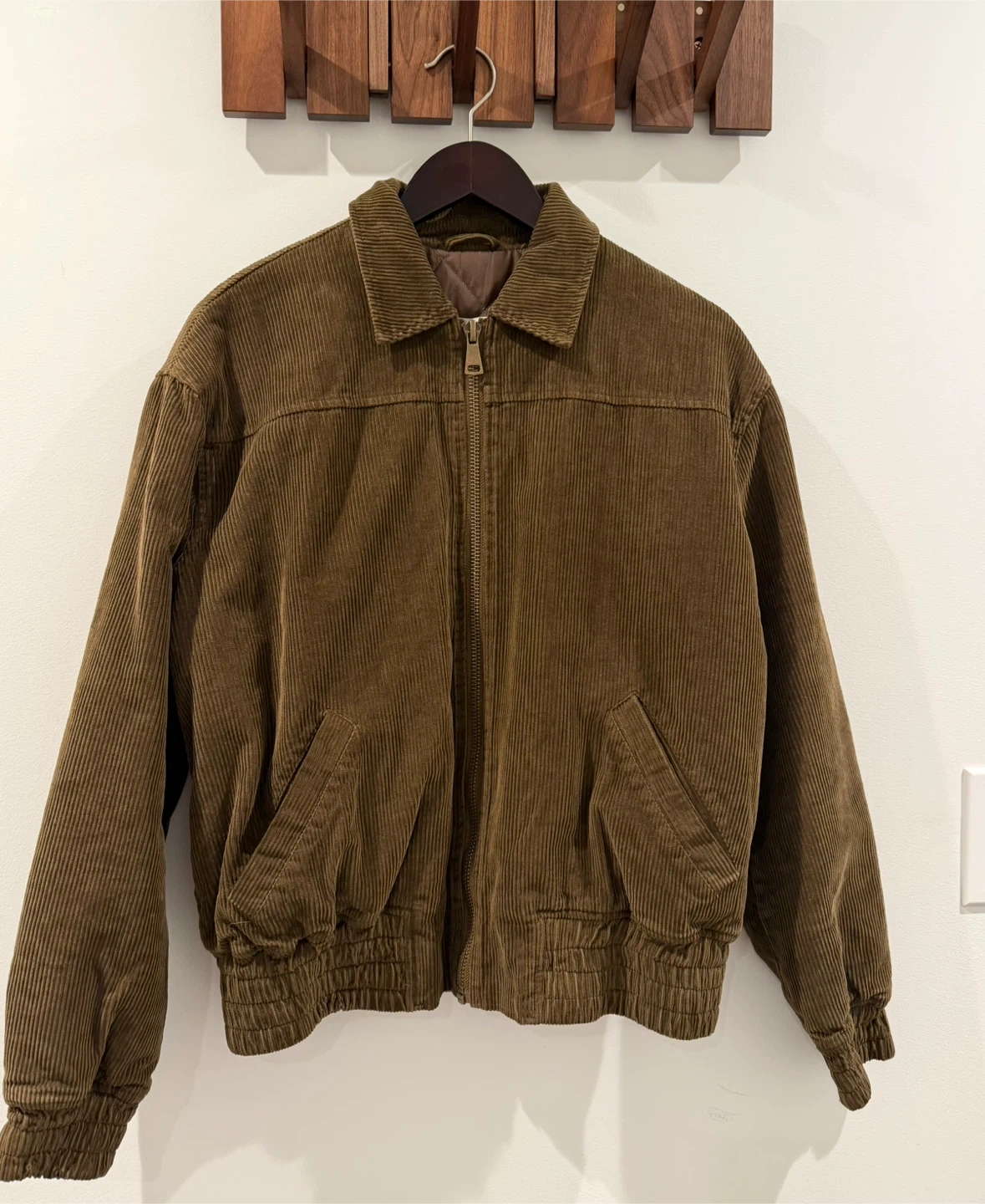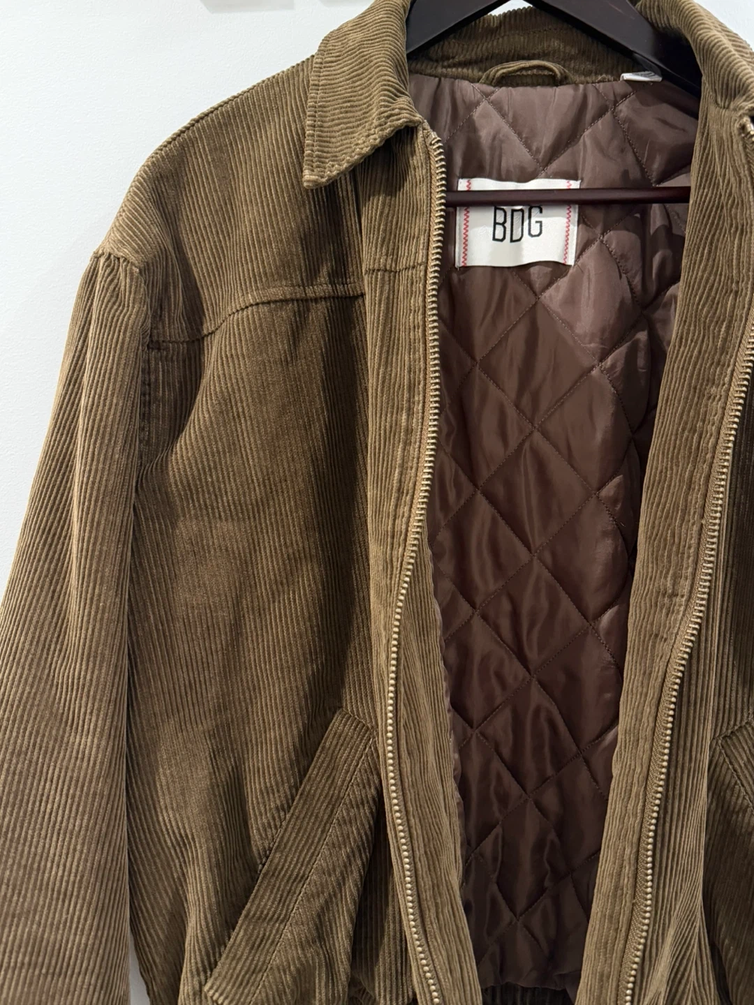 A stylish brown corduroy bomber jacket from BDG. It features a quilted lining for added warmth. This jacket is perfect for transitional season