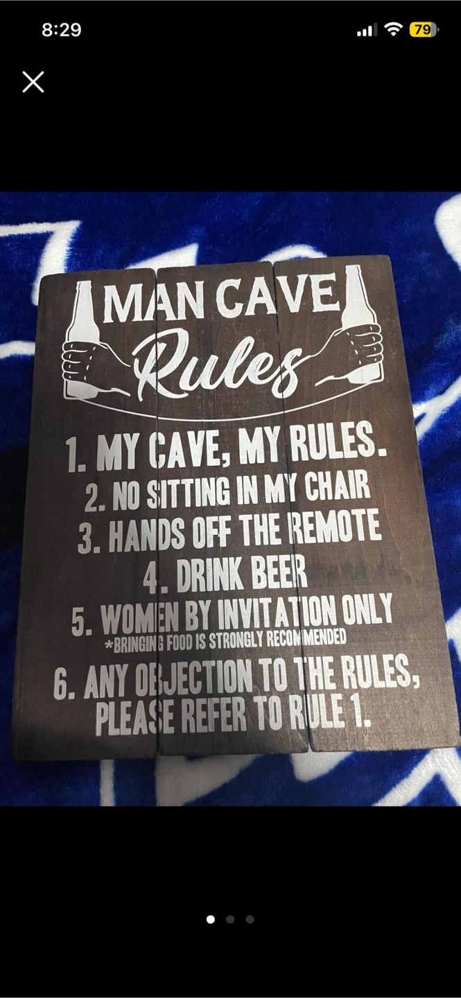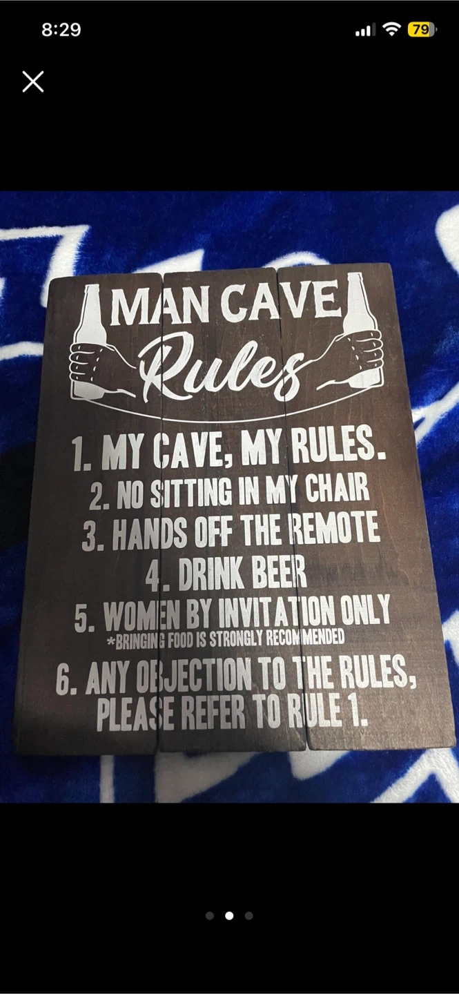Buy & SellMan Cave Rules Wood SignMan Cave Rules Wood Sign$10This is a wooden sign with "Man Cave Rules" printed on it. It's a fun piece to hang up in your space!ConditionLike newWHERE TO MEETCheck LocationView MapSELLERSoniaOakwood Village605 reviews0 chats·1 favorites·9 viewsSEND CHAT TO SELLERHi Sonia! I’m interested in your listing.Hi Sonia! I’m interested in your listing.Get the Karrot app to chatSign In to chat